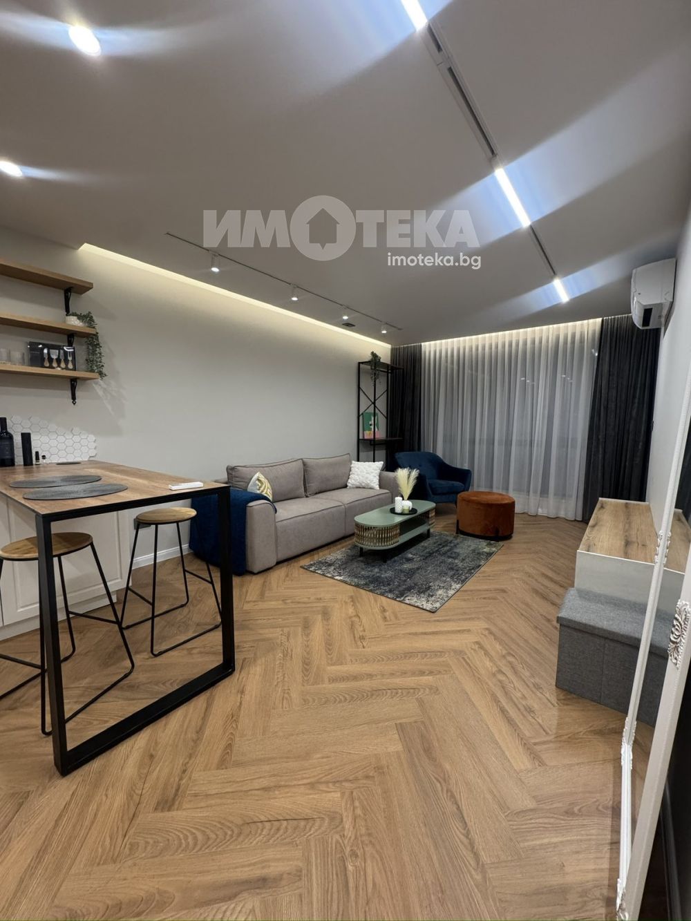 Апартаментът разполага с дневна с кухненски бокс, спалня (предстои да бъде напълно обзаведена според нуждите на наемателите), баня с тоалетна и функционално разпределение, подходящо за комфортно ежедневие.