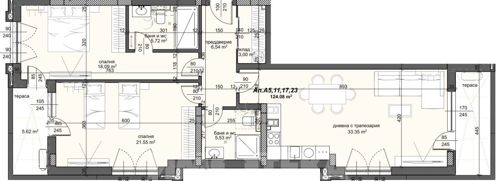 Тристаен апартамент, състоящ се от: дневна с трапезария, две спални, две бани с тоалетни, склад и две тераси. Подобни апартаменти се предлагат на различни етажи.
