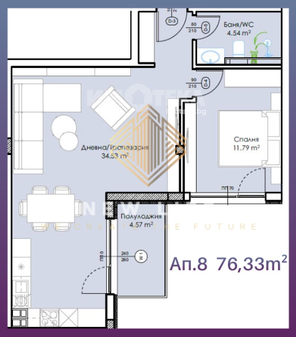 Разпределение хол с трапезария от 34 кв.м , самостоятелна спалня , баня с тоалетна , тераса тип лоджия .