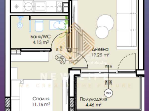 Разпределение хол с кухненски бокс , спалня , баня с тоалетна , тераса лоджия .
