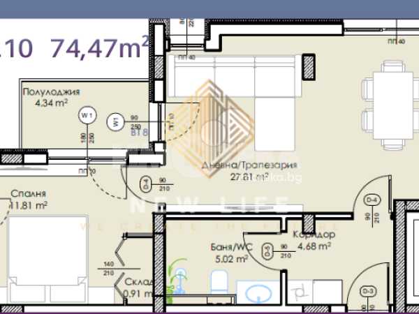 Разпределение хол страпезария ,спалня баня с тоалетна и тераса полулоджия .