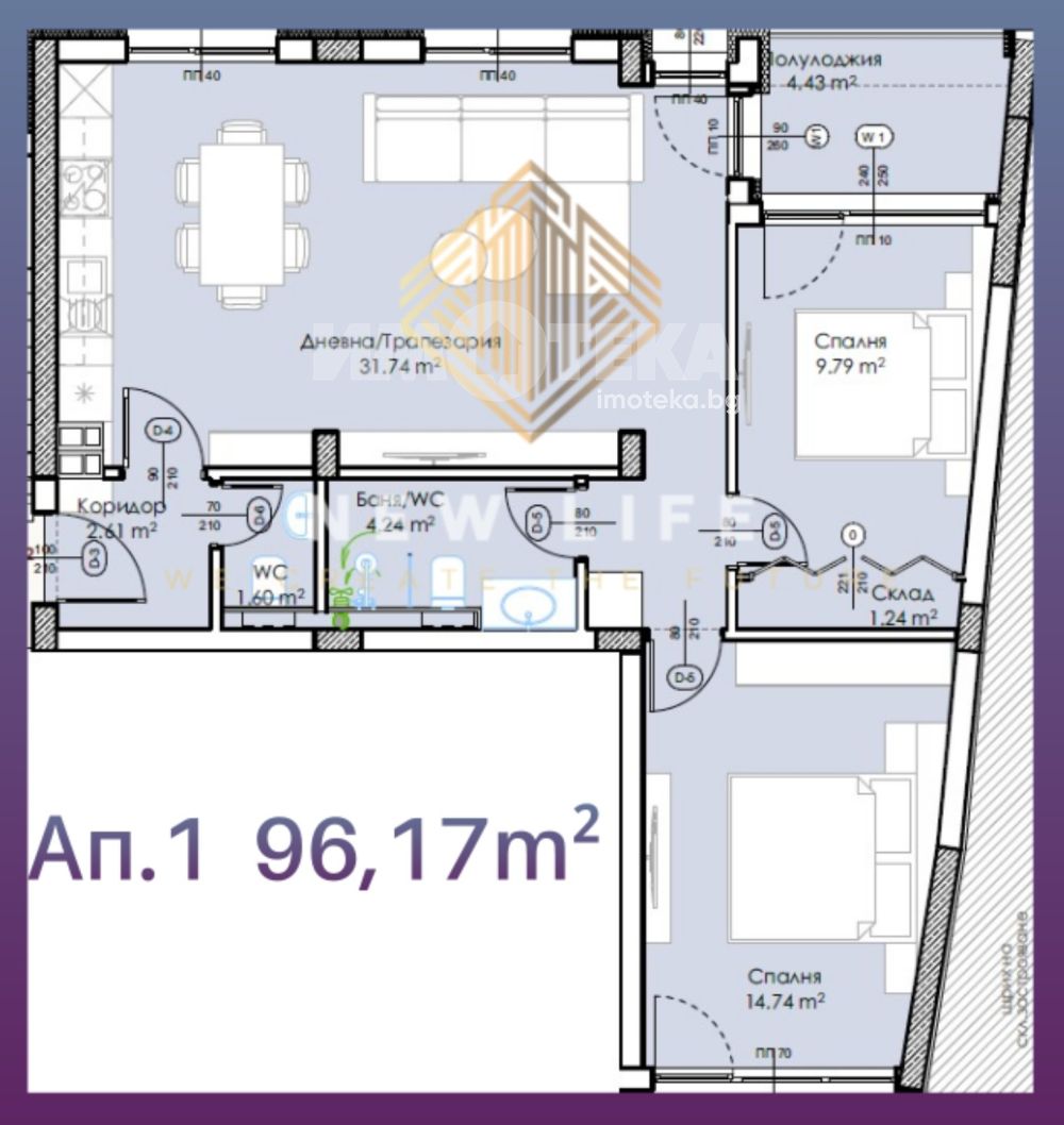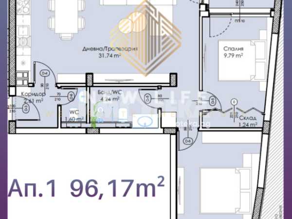 Разпределение - голям хол с трапезария , над 30 кв.м , две спални , баня с тоалетна , още една тоалетна , склад и тераса тип лоджия .