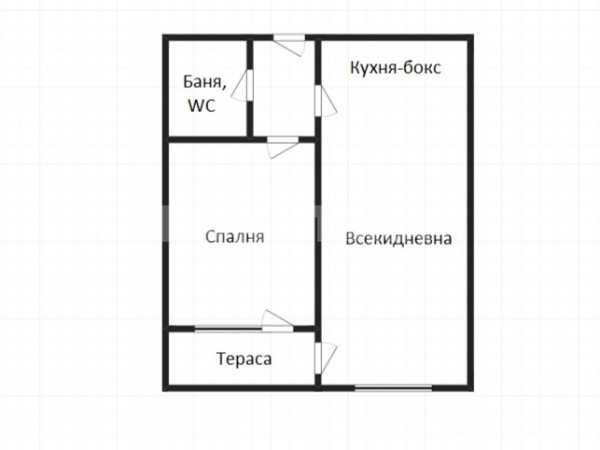 Двустаен тухлен апартамент с площ 58.62 кв.м, състоящ се от дневна с трапезария и кухня,преходна спалня, баня + WC, коридор и тераса.