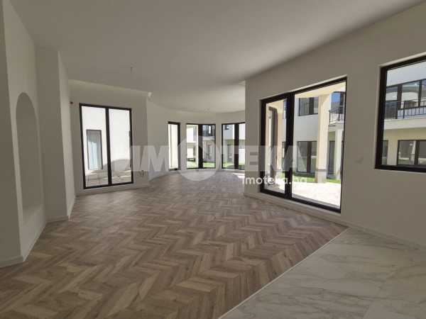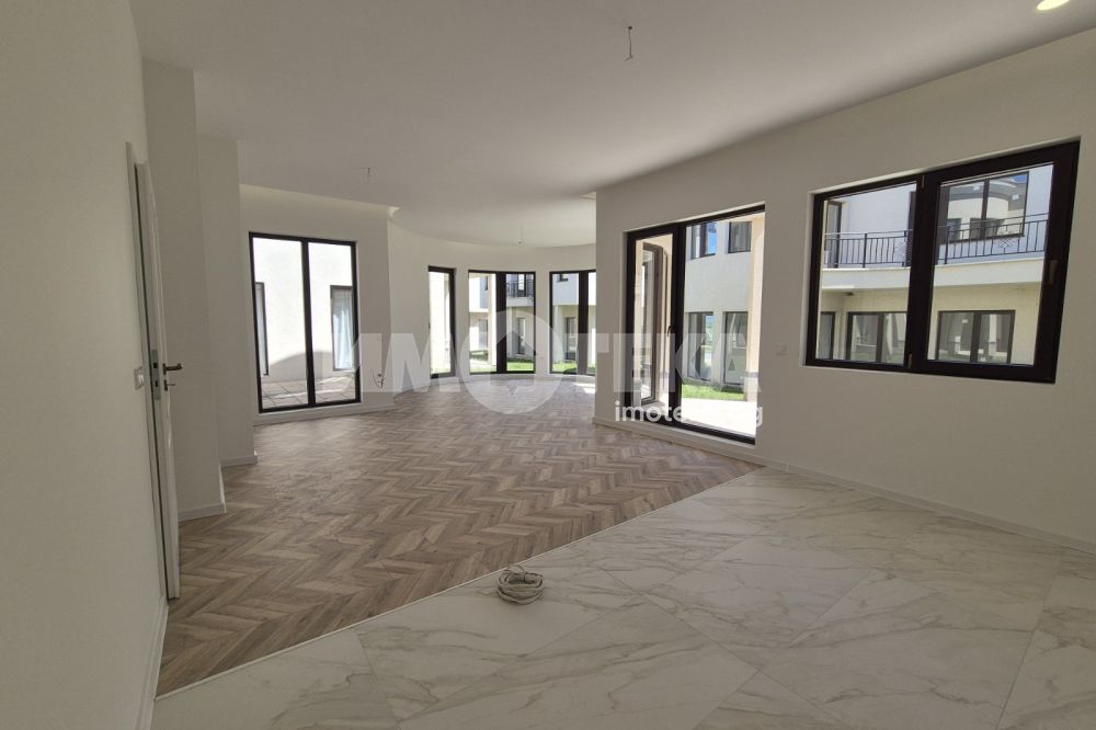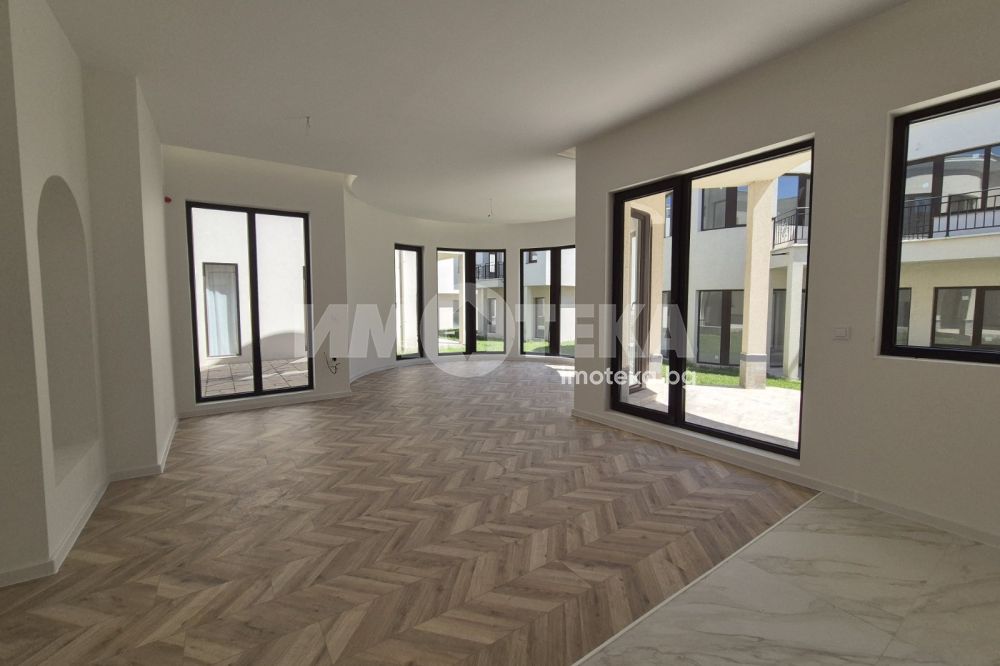 На първия етаж е разположена кухнята и трапезарията, баня с тоалетна, мокро помещение, гардеробно помещение и гостната, която се намира в ротондата на къщата.,излаз на просторна тераса с изглед към вътрешния двор.