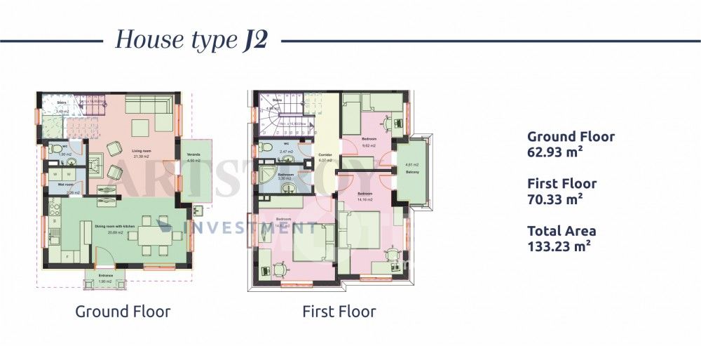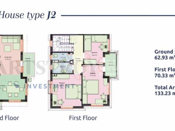 Първи етаж : антре, стълби, отвеждащи към втория етаж, обширна всекидневна с кухненски бокс, баня с тоалетна, мокро помещение, веранда с изглед към двора.