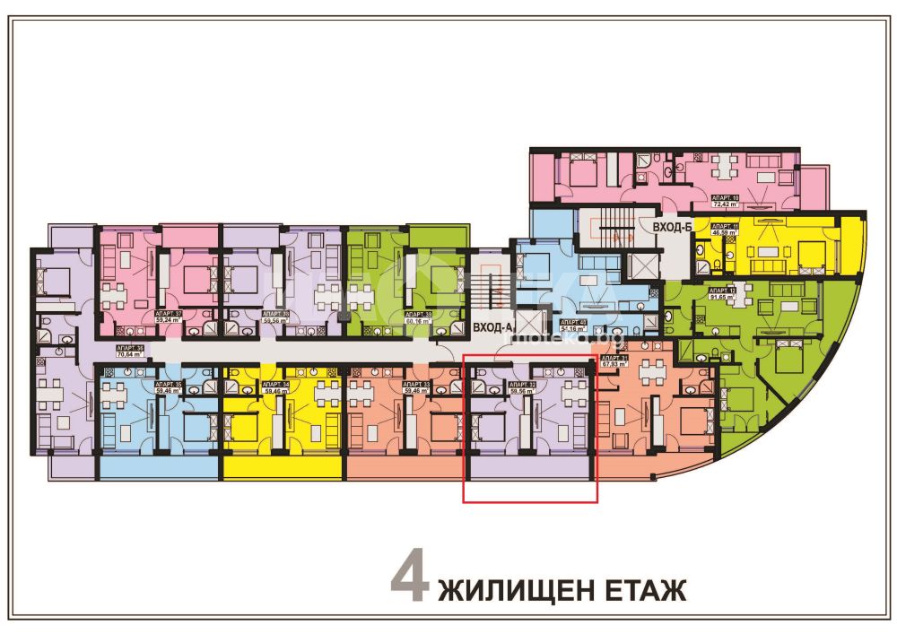 Двустаен апартамент в нова жилищна сгада в Поморие. 500 м. от морето. Имотът е с площ 59,56 кв. м., етаж 4 от 6, асансьор. Състои се от: коридор, просторна дневна с кухненски бокс и спалня с обща тераса, баня с тоалетна и скрадово помещение.