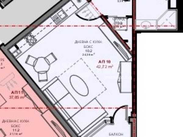 Едностаен тухлен апартамент с площ 50.39 кв.м и се състои от просторна дневна с кухненски бокс ,кът за спане ,баня +WC ,коридор ,балкон