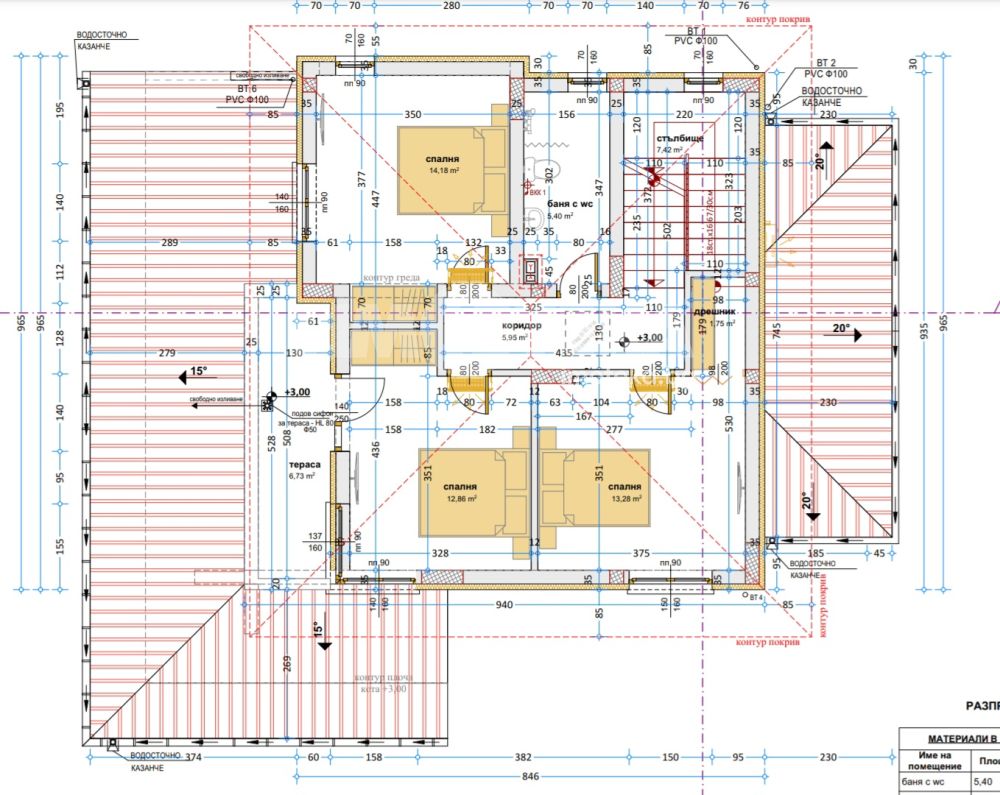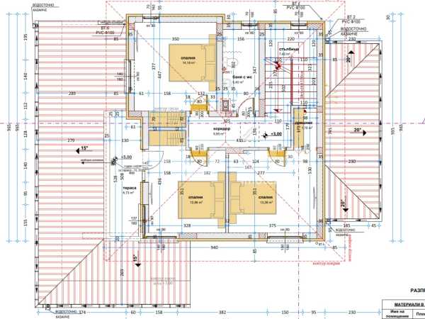 Втори етаж: три спални, дрешник, , баня с тоалетна, тераса и коридор.