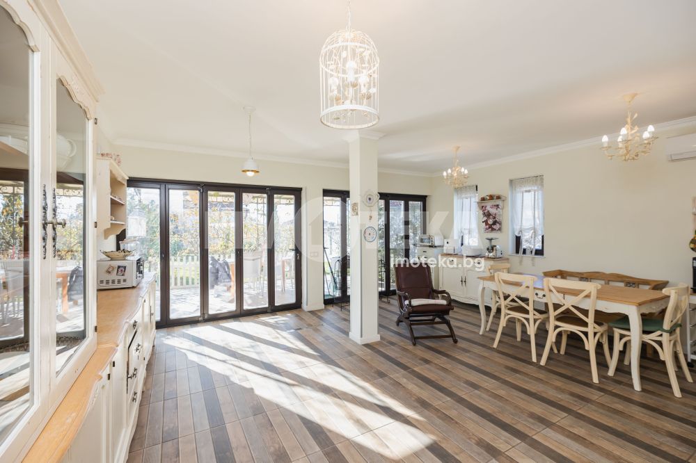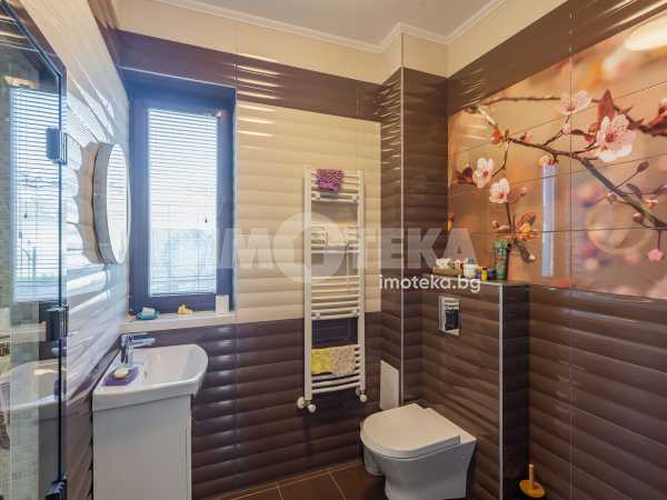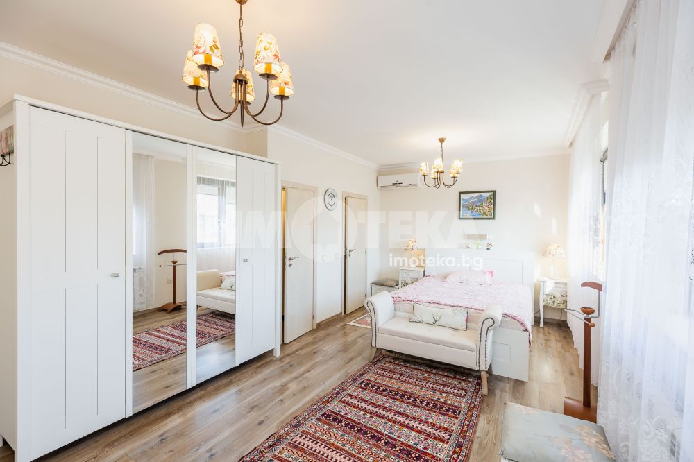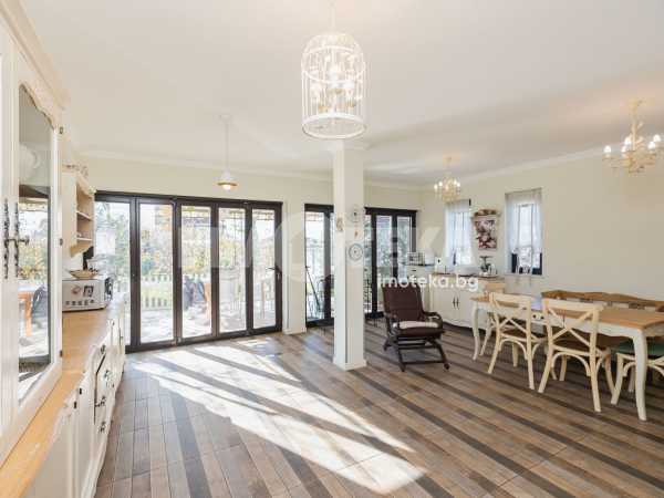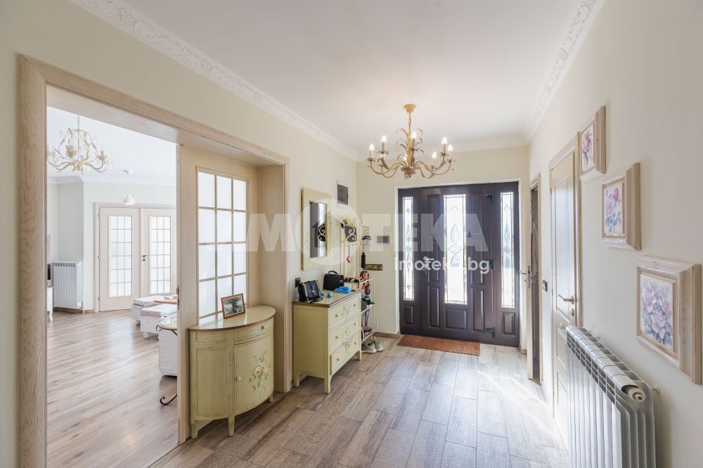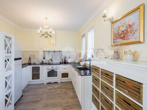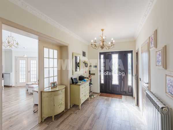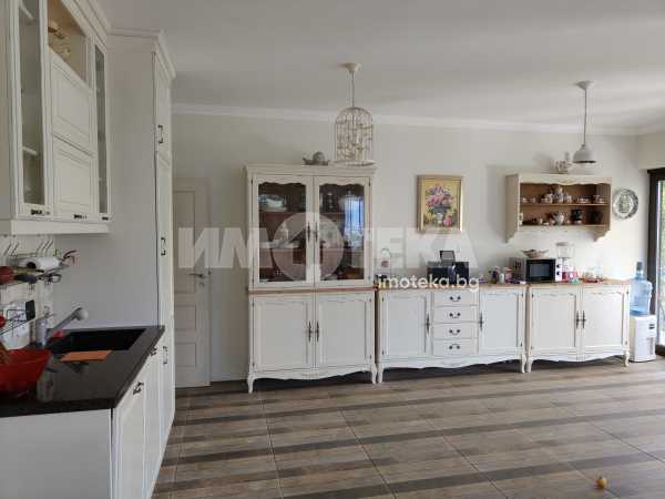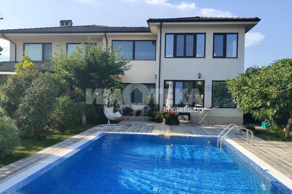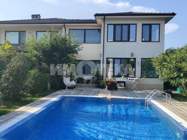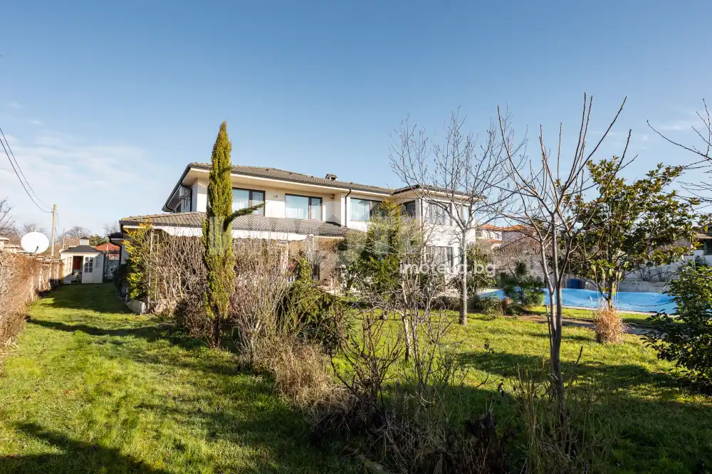 Еднофамилна, двуетажна къща със ЗП - 235 кв.м и РЗП - 400 кв.м, разположена в парцел с площ 1100 кв.м. Къщата се състои на 1 во ниво от дневна, в центъра на която има камина от естествен какмък, кухня с трапезария, бильярдна зала, баня с тоалет, парна баня също с тоалет, коридор, лятна кухня 36 кв.м, подземна маза и стълбище към 2 ро ниво. На 2 етаж има три спални, всяка с дрешник и баня с тоалет, офис - кабинет, фитнес зала и перално помещение. В дворното пространство, много добре озеленено и поддържано има над 50 вида рози от Англия, плодови дърветата (вишнап, круша, яблъка, череша, райска яблъка, асми с грозде), автоматична поливна система с наличие на два резервоара по 7 м3 за полив и хидрофор. Има басейн с термопомпа 5х8 м, 70 кубика солена вода, електролизер и УВ лампа. Навес за паркиране, голяма порта с GSM модем и ел. двигател, просторна тераса с маркиза и BBQ. В двора има склад за градинарски инструменти и работилница.