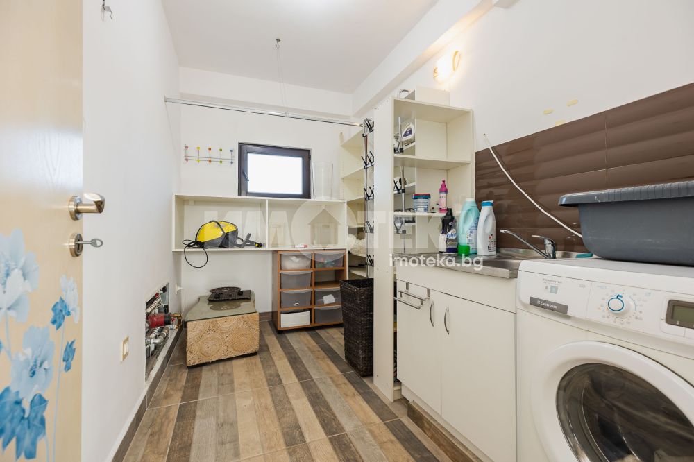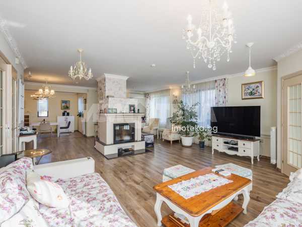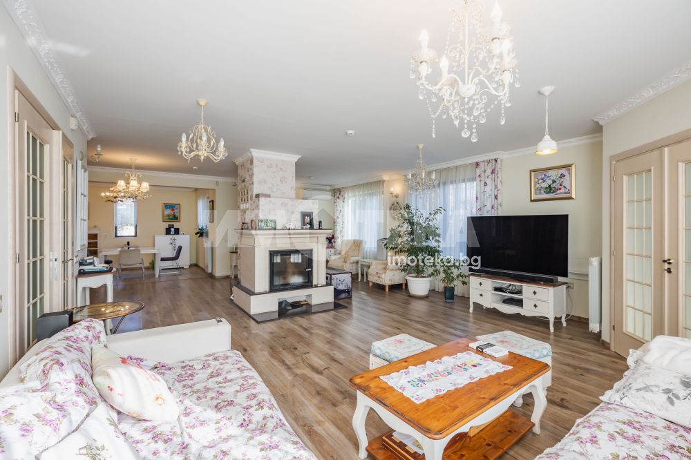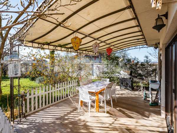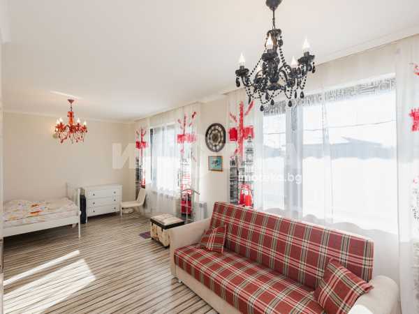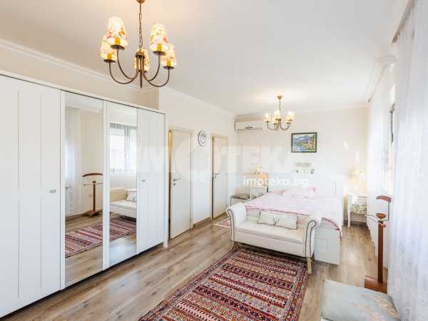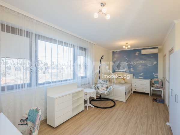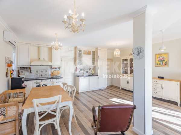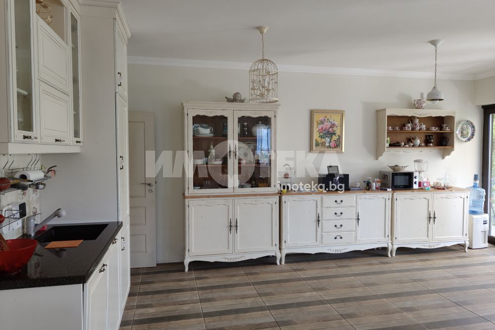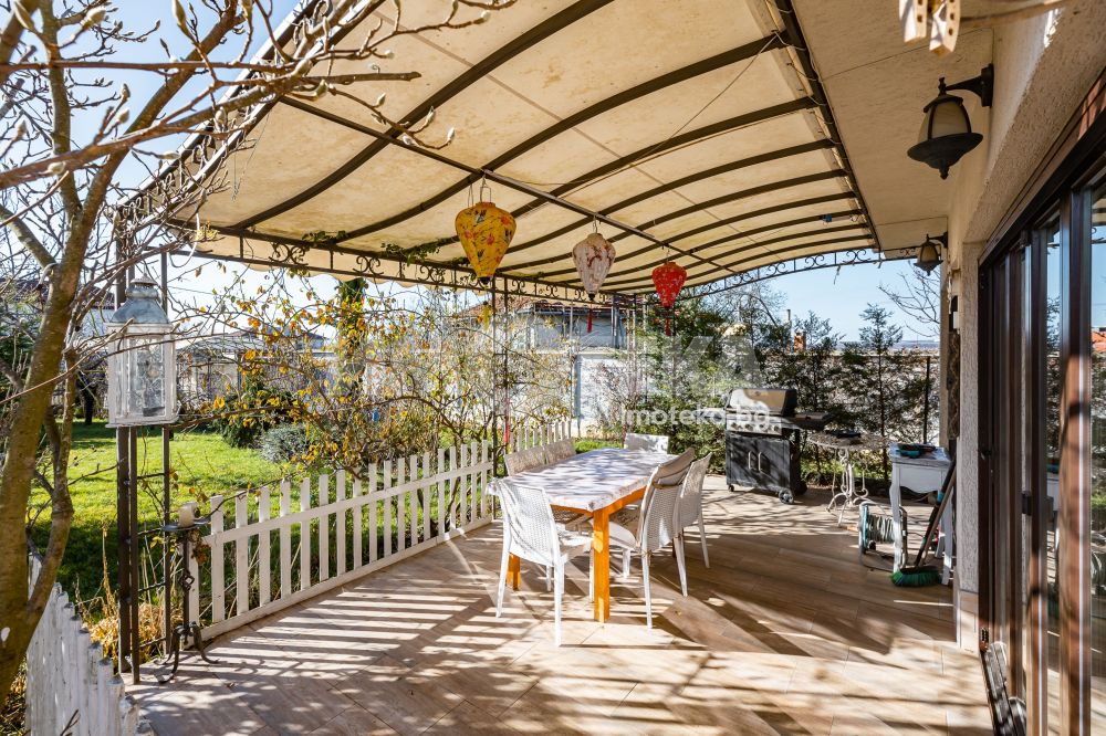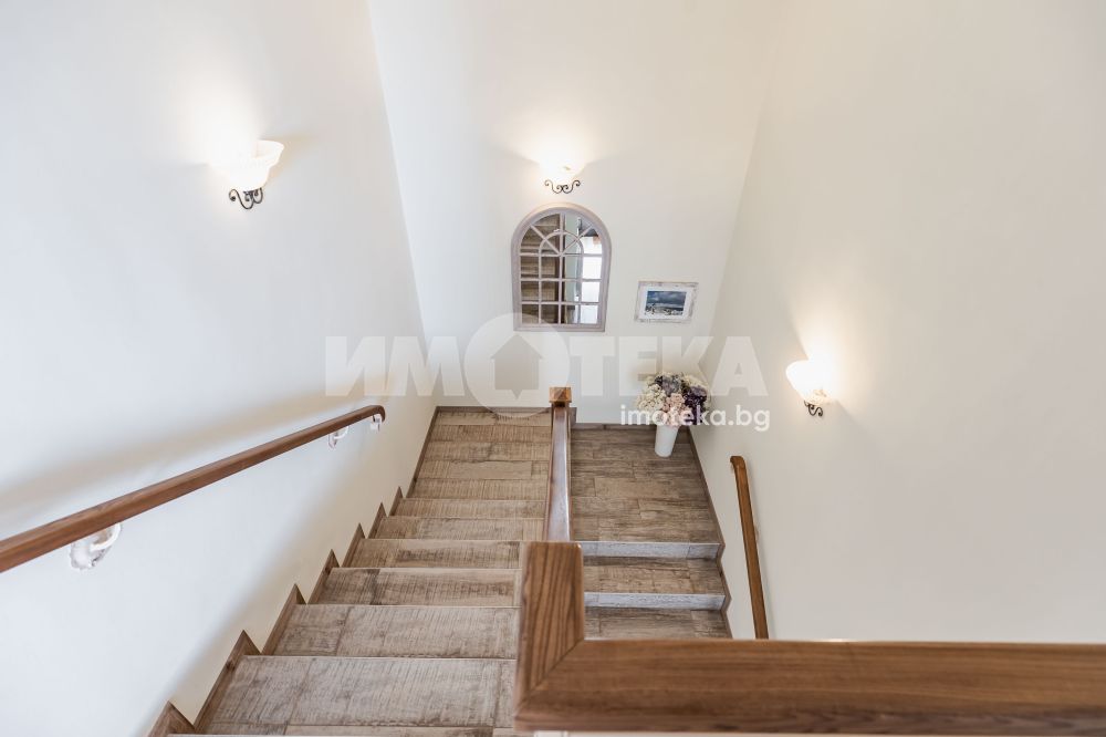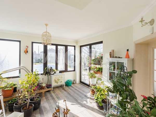 Еднофамилна, двуетажна къща със ЗП - 235 кв.м и РЗП - 400 кв.м, разположена в парцел с площ 1100 кв.м. Къщата се състои на 1 во ниво от дневна, в центъра на която има камина от естествен какмък, кухня с трапезария, бильярдна зала, баня с тоалет, парна баня също с тоалет, коридор, лятна кухня 36 кв.м, подземна маза и стълбище към 2 ро ниво. На 2 етаж има три спални, всяка с дрешник и баня с тоалет, офис - кабинет, фитнес зала и перално помещение. В дворното пространство, много добре озеленено и поддържано има над 50 вида рози от Англия, плодови дърветата (вишнап, круша, яблъка, череша, райска яблъка, асми с грозде), автоматична поливна система с наличие на два резервоара по 7 м3 за полив и хидрофор. Има басейн с термопомпа 5х8 м, 70 кубика солена вода, електролизер и УВ лампа. Навес за паркиране, голяма порта с GSM модем и ел. двигател, просторна тераса с маркиза и BBQ. В двора има склад за градинарски инструменти и работилница.