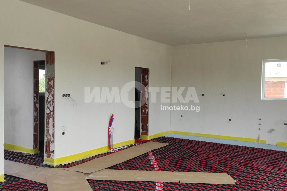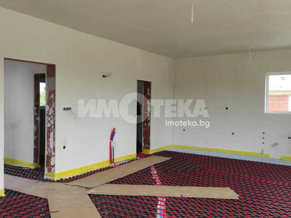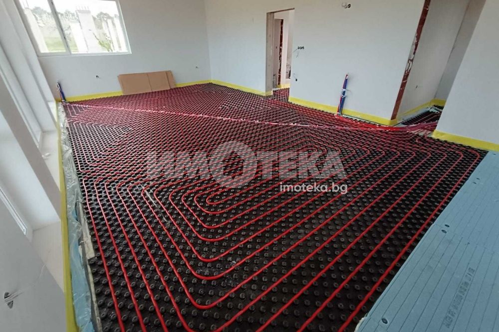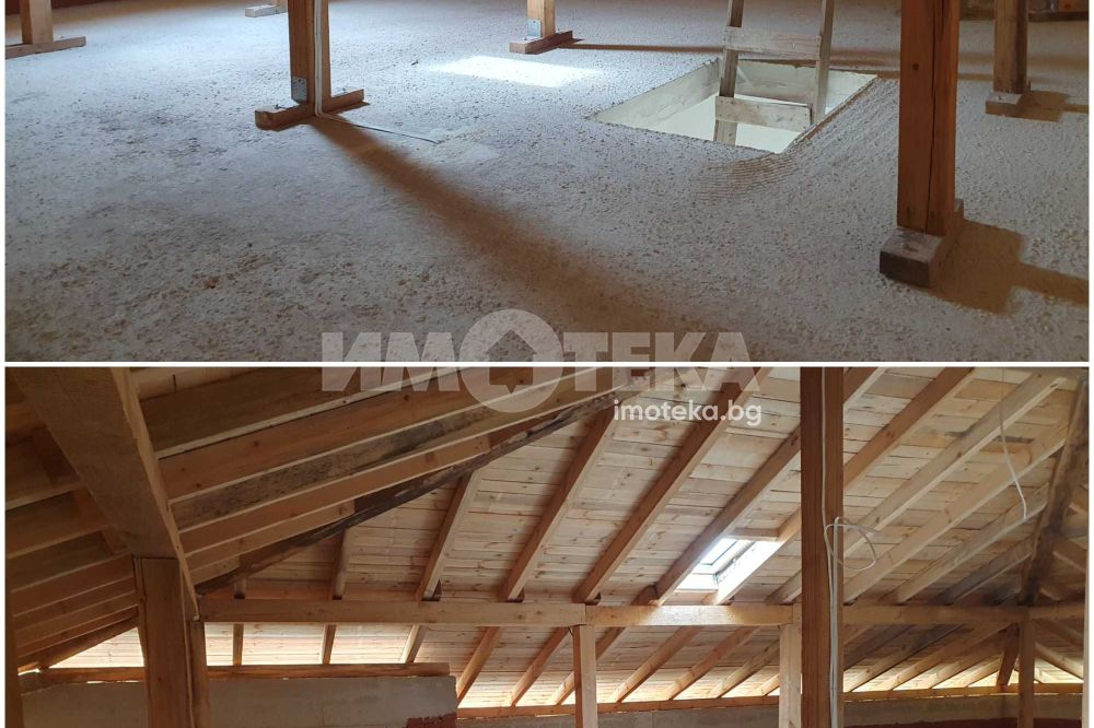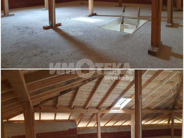 Таванското помещение на къщата с височината му е 2.5 метра. Отоплението на къщата е с ТЕРМОПОМПА, конвектори и лира в банята. Поставено е подово отопление със съответната изолация, бойлер за двете бани захранвано от термопомпата. Къщата се предлага завършена по БДС. Разположена в парцел с площ 579 кв.м. Предвидени са паркоместа за няколко автомобила.
