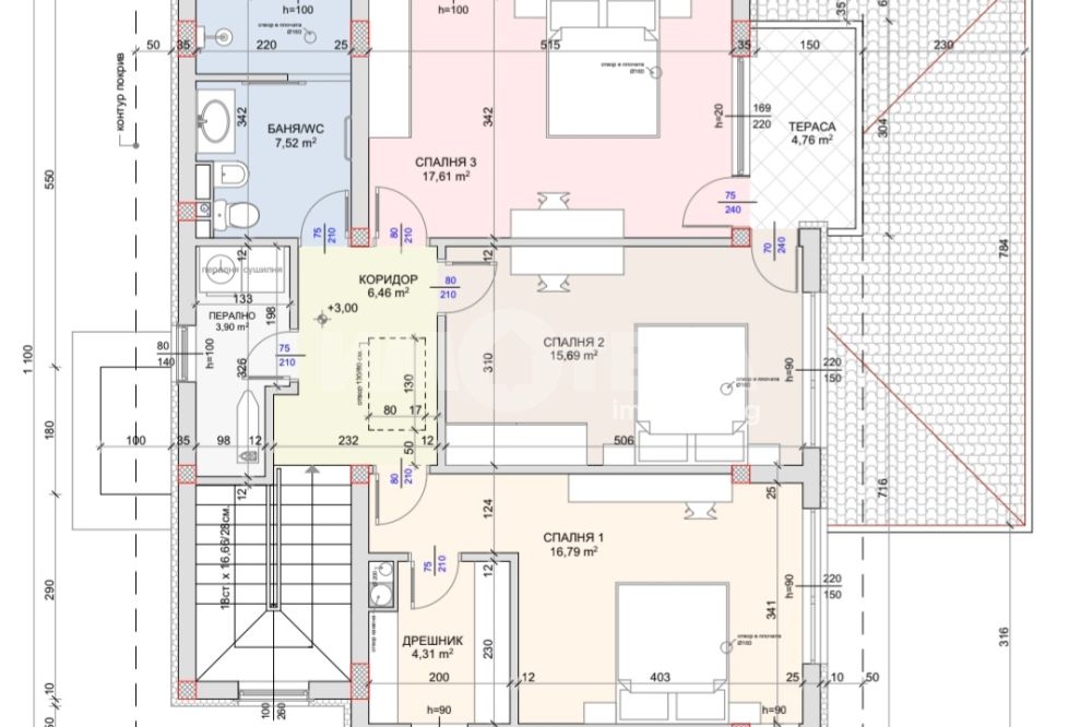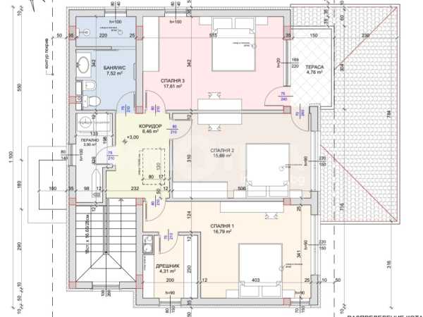 На втория етаж три спални по 15 -16 кв, баня и тоалет на етажа, перално, гардеробна . От двете спални се излиза на обща тераса. Всички помещения в сградата са ориентирани изцяло на юг.