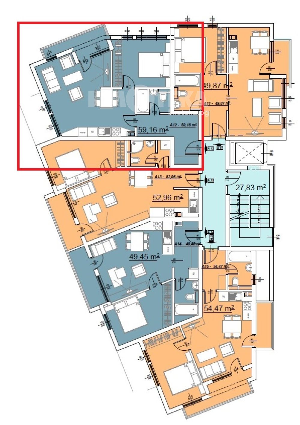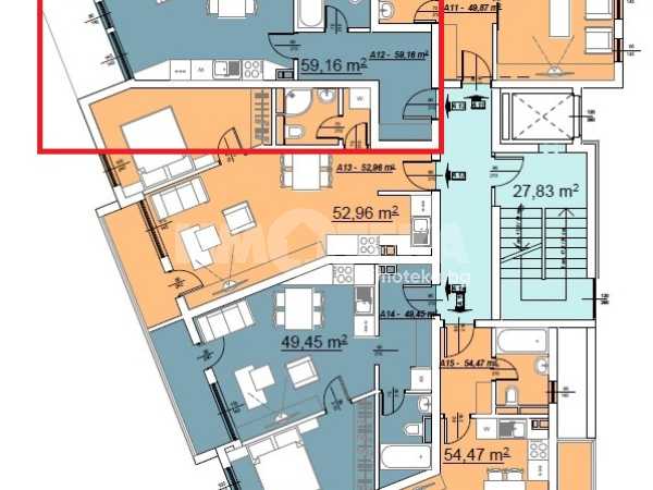 Площ на имота 65,96 кв. м., етаж 2. Състои се от коридор, баня с тоалетна, дневна с кухненски бокс, спалня и тераса.