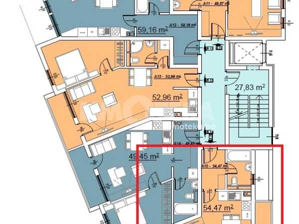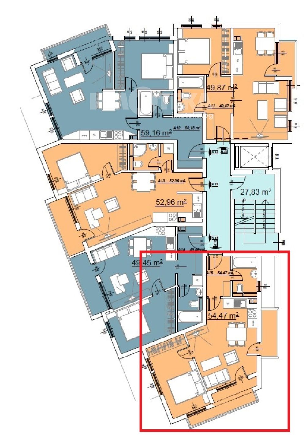 Площ на имота 60,86 кв. м., етаж 2 (над партер), асансьор. Състои се от коридор, баня с тоалетна, дневна с кухненски бокс, от която се излиза на тераса, спалня с тераса.