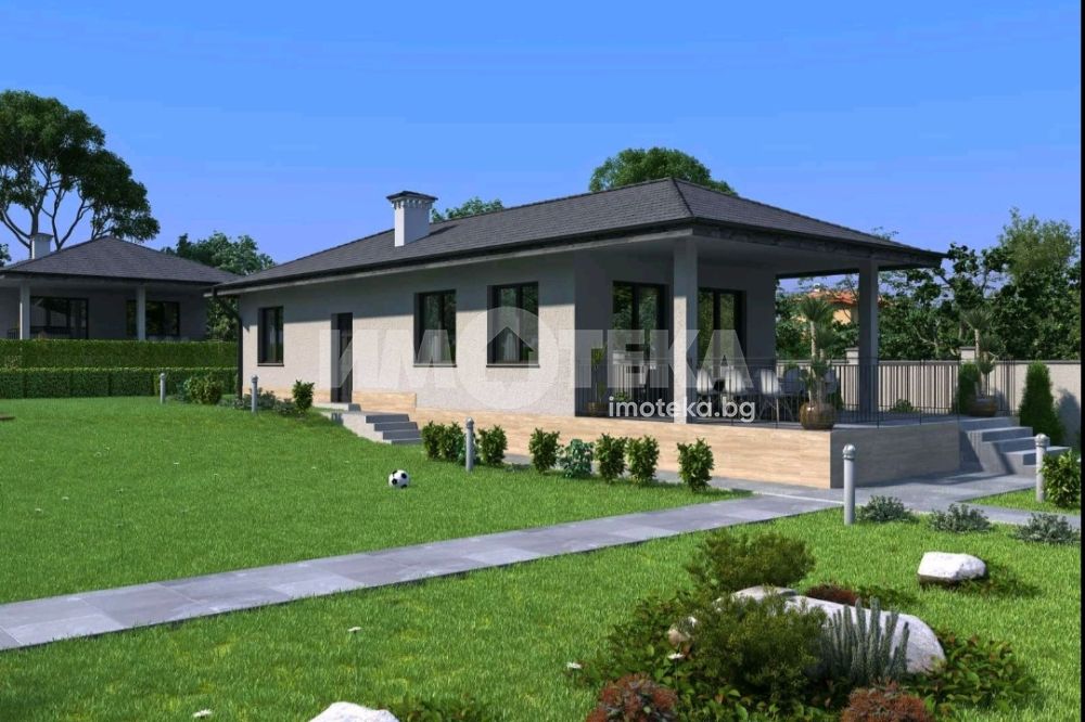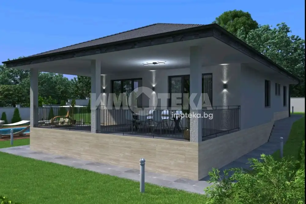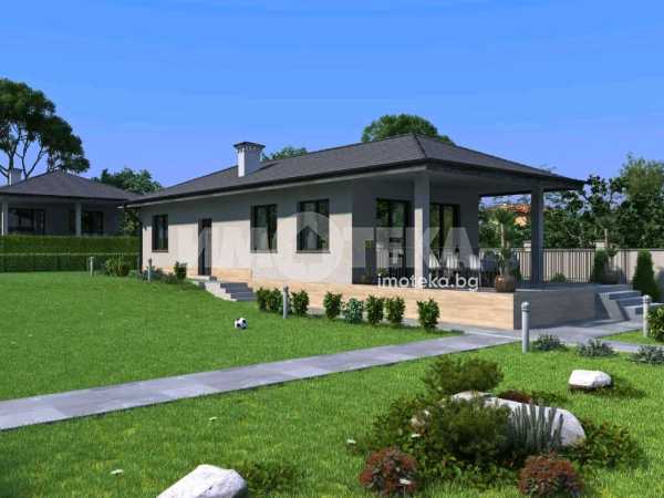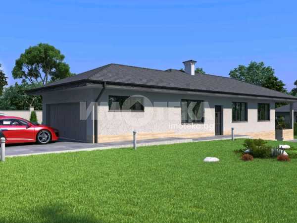 Предлагаме едноетажна къща в самостоятелен двор с площ 1000 кв.м. Върху площ от 178 кв.м. са разположени голям дневен тракт- 41,50 кв.м., три спални / 14 кв.м., 14 кв.м., 12,50 кв.м./, отделно баня, тоалет, антре, килер, веранда 33, 70 кв.м., два гаража.