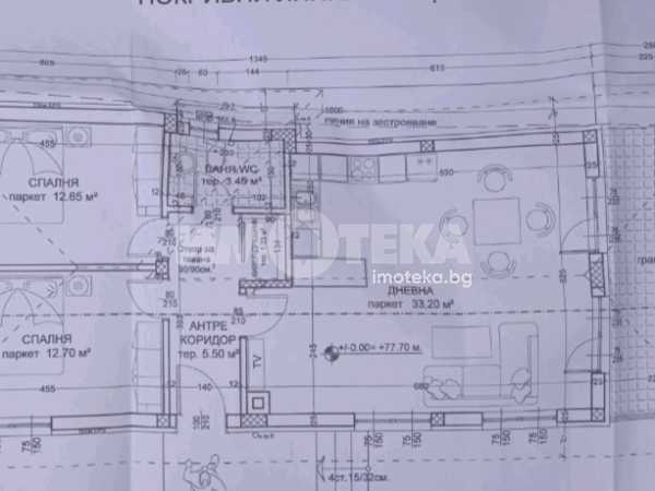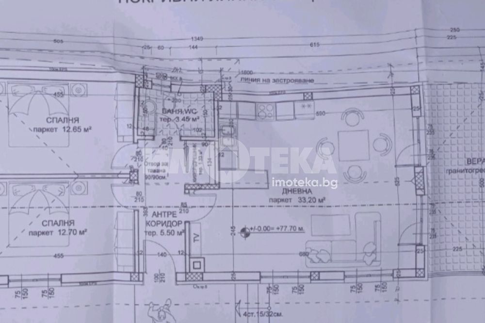Предлагаме, едноетажна къща в самостоятелен двор с площ 1000 кв.м. Върху площ от 95 кв.м. са разположени голям дневен тракт – 33,20 кв.м., две спални /12,65 кв.м.,12,70 кв.м./, баня и тоалет, антре, килер, веранда 34,75 кв.м.