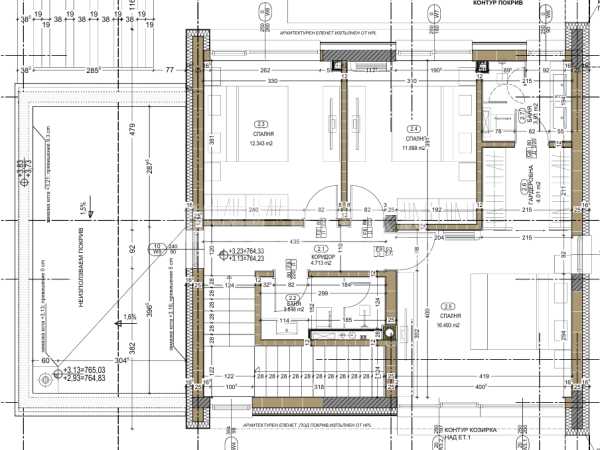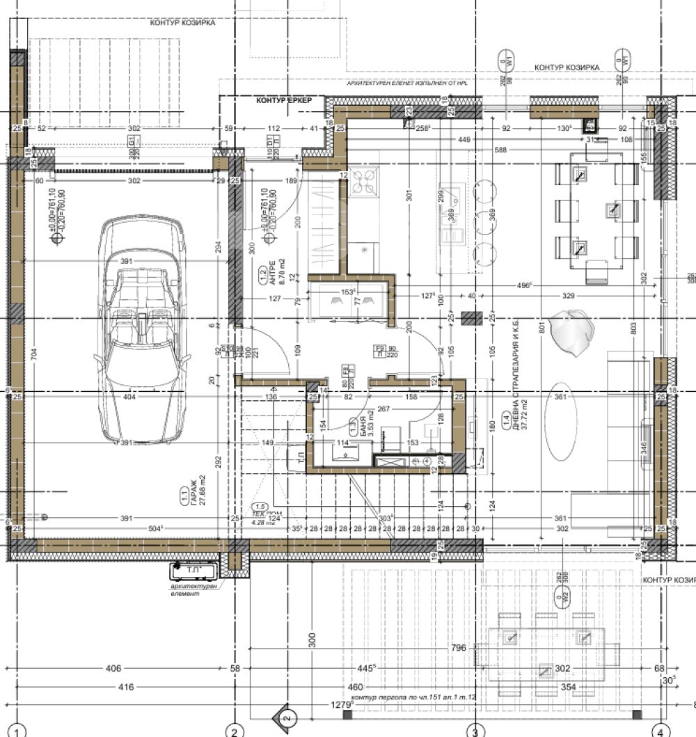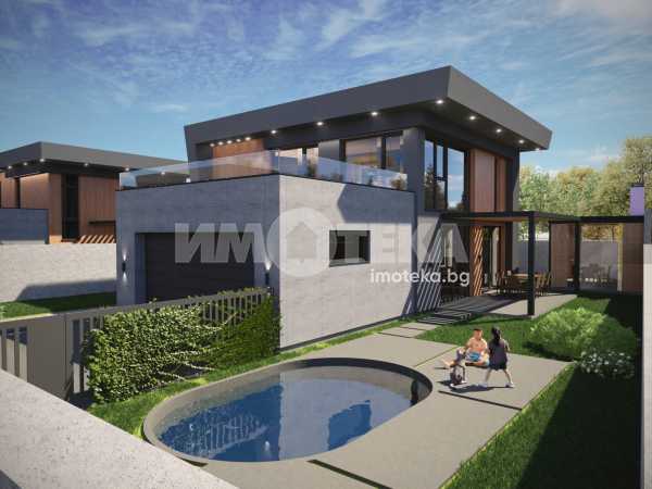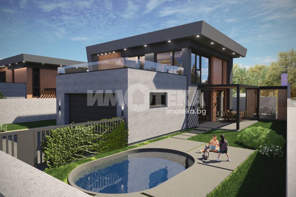 Къщата е разположена на два етажа със застроена площ от 109 кв.м. и следното разпределение: първо ниво - просторна дневна с трапезария и кухненски бокс, баня с тоалетна, мокро помещение, веранда и топла връзка с гаража. На второ ниво е разположена родителска спалня с дрешник и баня с тоалетна, две детски спални и отделна баня с тоалетна.
