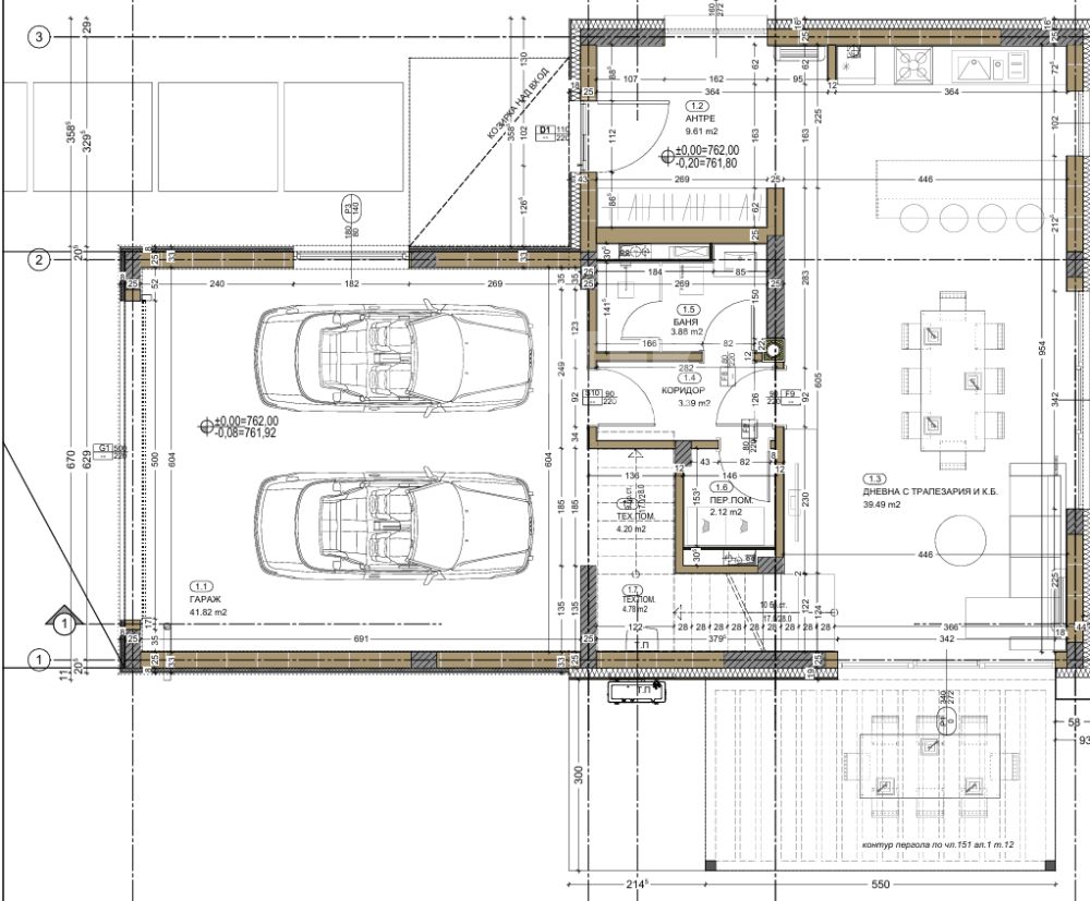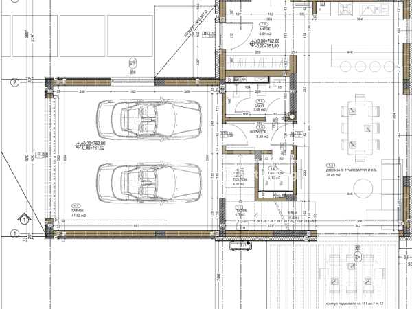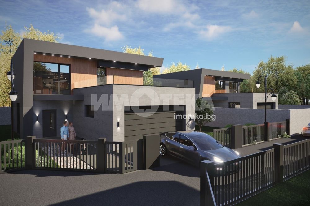 Къщата е разположена на два етажа със застроена площ от 134кв.м. и следното разпределение: първо ниво - просторна дневна с трапезария и кухненски бокс, баня с тоалетна, мокро помещение, веранда и топла връзка с гаража. На второ ниво е разположена родителска спалня с дрешник и баня с тоалетна, две детски спални и отделна баня с тоалетна.