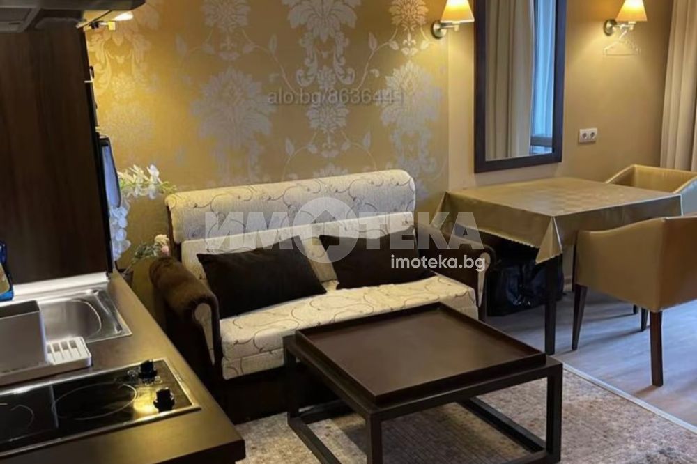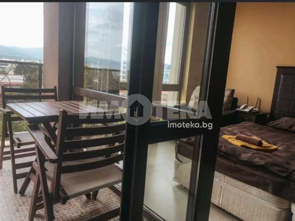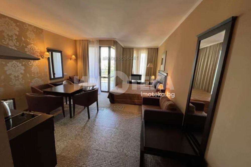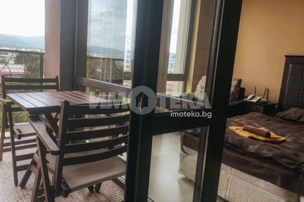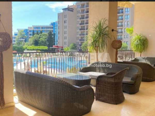 Студио в затворен комплекс в цетъра на к. к. Слънев бряг. Имотът е 55 кв. м., етаж 3 от 7 с асансьор. Състои се от: дневна с кухненски бокс, тераса, баня с тоалетна. Напълно обзаведено и оборудвано. Такса поддръжка 22 евро на кв.м за година. Комплексът впечатлява с мащаб, добре поддържана територия, три открити и един закрит басейн, барове и ресторанти, фитнес зала, спа център, детски площадки и стаи, конферентна зала, подземен паркинг, денонощна охрана.Търговски център със световни марки, аптеки, банки, ресторанти, барове и всички забавления на курорта са на пешеходно разстояние.