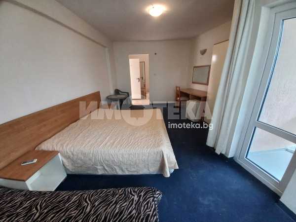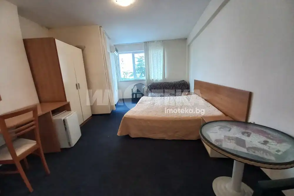 Жилищен комплекс в Слънчев бряг БЕЗ ТАКСА ПОДДРЪЖКА! , Намира се в района на Какао Бийч. Разполага със студиа и двустайни апартаменти. Басейн. Студио с площ 42,06 кв. м., етаж 4. Състои се от антре, стая, в която може да бъде обособен кухненски бокс, спален кът, тераса, баня с тоалетна.