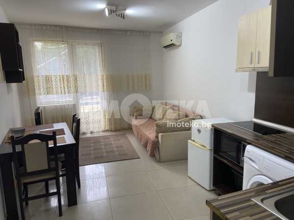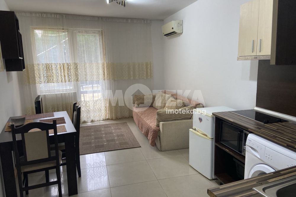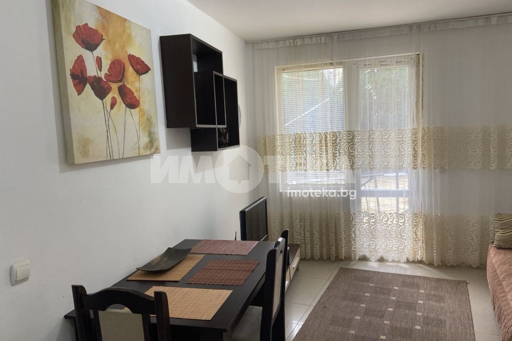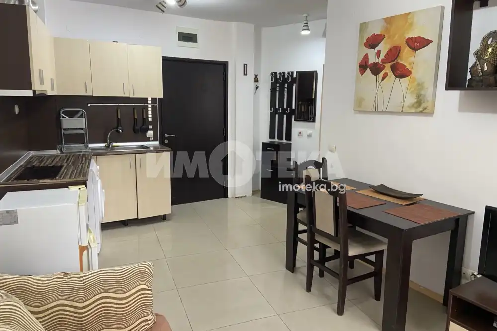Двустаен апартамент в Слънчев бряг. Апартаментът е с жилищна площ 47 кв. м., намира на първи етаж. Състои се от хол с кухненски кът, спалня, баня с тоалетна и тераса пред двете стаи. Обзаведен, готов за живене или отдаване под наем. Такса поддръжка 200 евро на година. Възможност за паркиране.