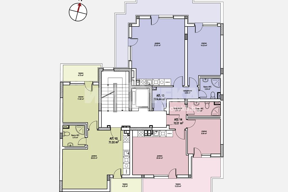 Двустаен апартамент със застроена площ от 88 кв.м. Състои се от: коридор, всекидневна с кухненски бокс, спалня, баня с тоалетна и голяма панорамна тераса.