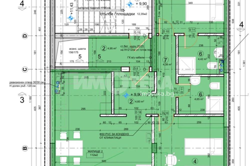 Апартамент №2 Тристаен апартамент, разположен на кота +9.90 м, с чиста площ 112 кв.м и обща площ 135,29 кв.м. Разпределението включва: входно антре дневна с трапезария и кухненски бокс коридор спалня с тераса детска стая баня с тоалетна втора баня с тоалетна. Към имота принадлежи мазе №2 с площ 6,78 кв.м.