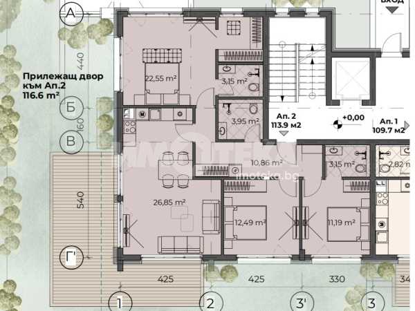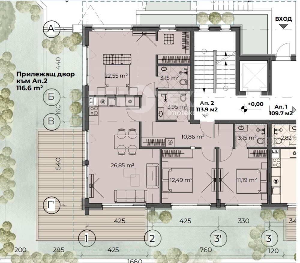 Апартамент 1 в сграда 2 е прекрасно и огромно тристайно жилище, към което принадлежи 150 кв.м партерна тераса/градина. Чистата светла застроена площ на апартамента е 103 кв.м, разпределени в хубав южен хол около 32 кв.м, една детска спалня, също южна, баня, коридор и голяма родителска спалня /18 кв.м/ със собствен дрешник /4,5 кв.м/ и собствена баня /3,20 кв.м/.