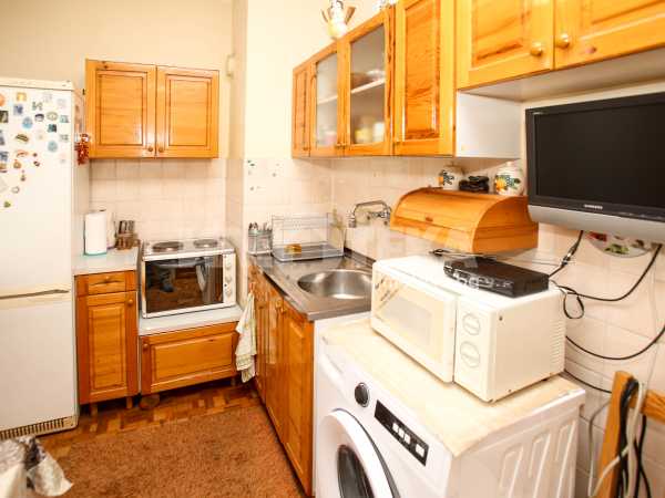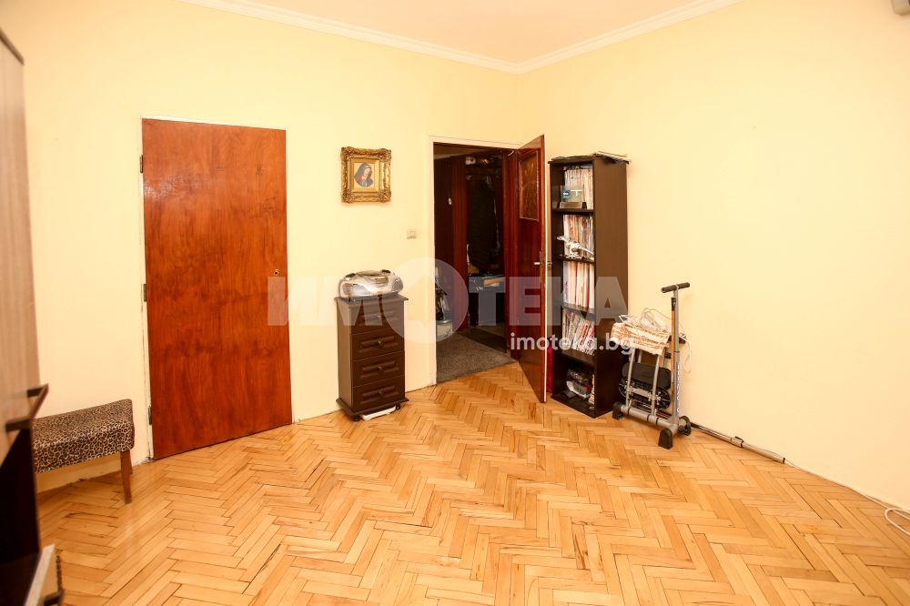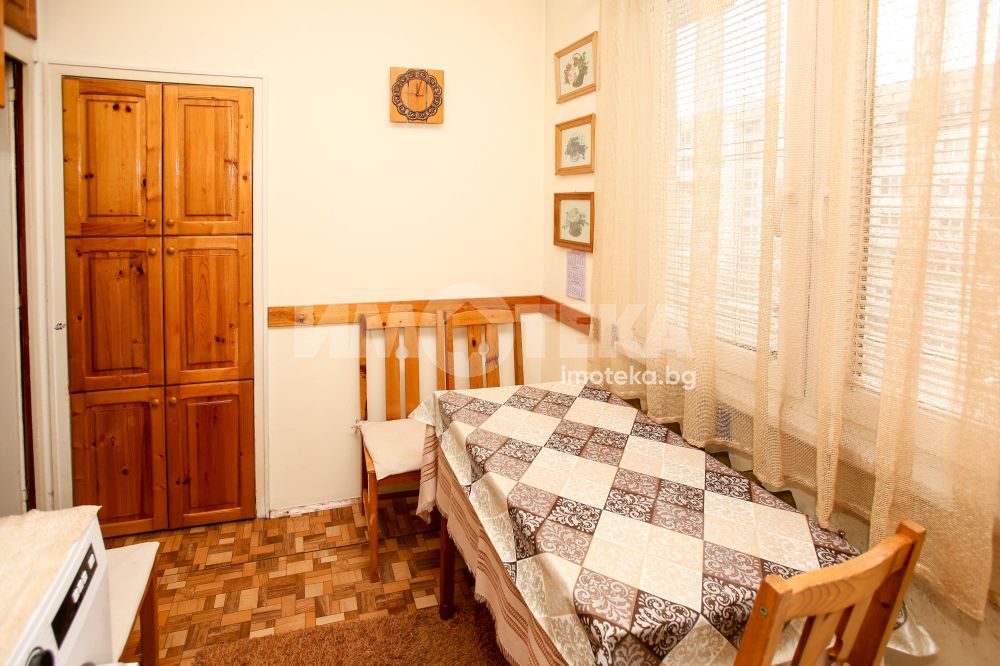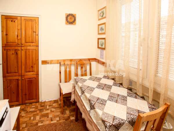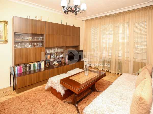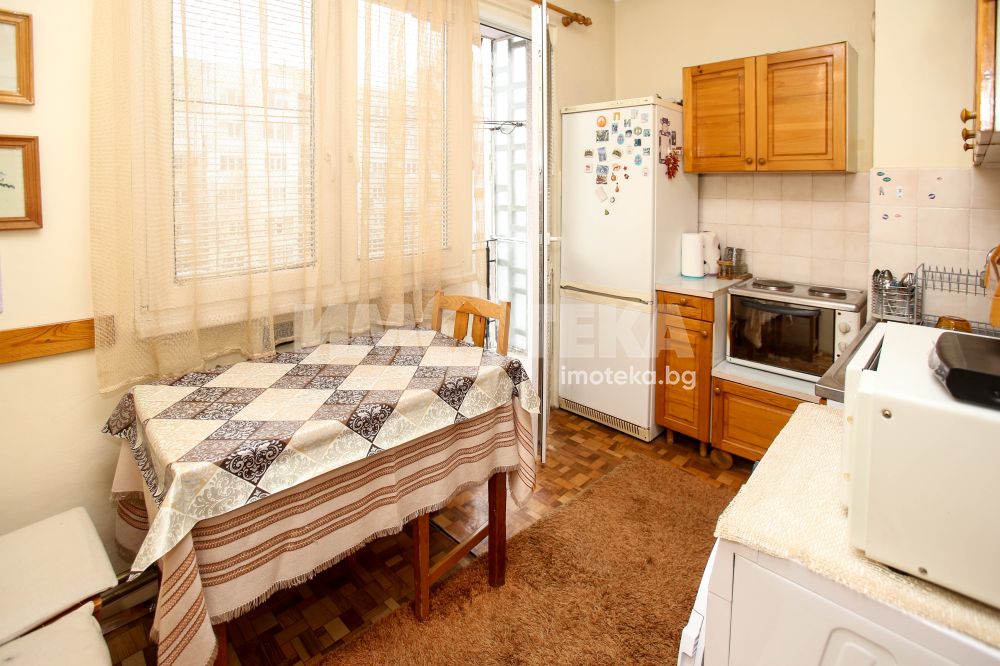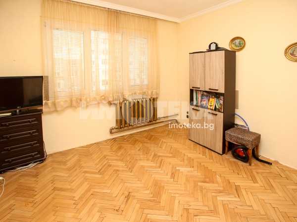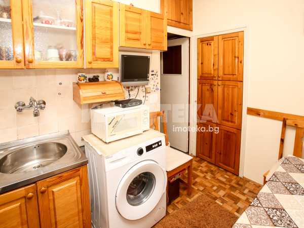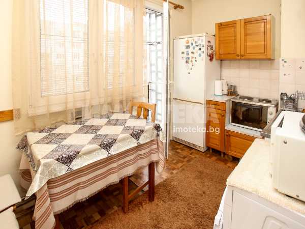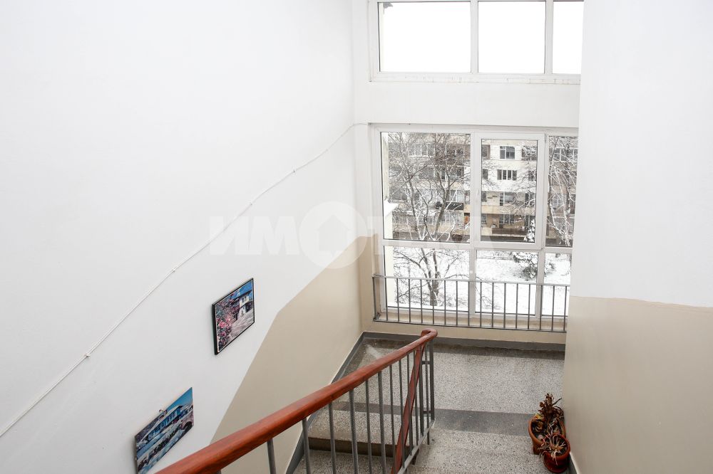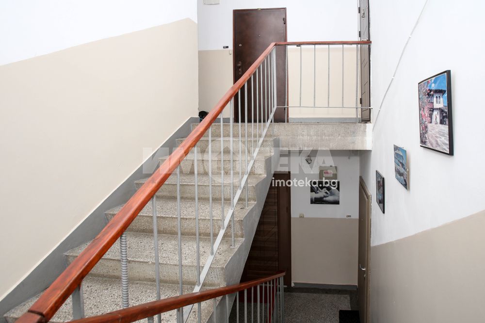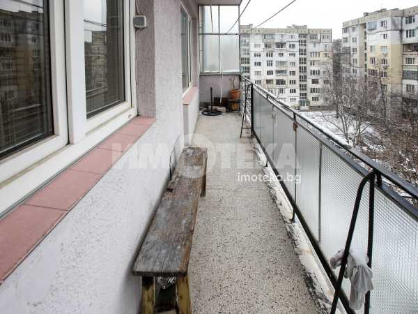Непреходен двустаен апартамент със застроена площ от 56,48 кв.м., състоящ се от дневна , кухня(с голям балкон пред тях), спалня с дрешник към нея, баня и отделна тоалетна. Жилището е със сменена дограма навсякъде. Вертикалните щрангове са подменени с нови също. Поддържан и уютен имот с изцяло южно изложение.