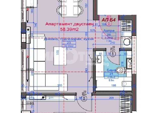 Двустаен апартамент със ЗП-58,39м2 и РЗП-68м2, състоящ се от: антре, просторна дневна с кухненски бокс и трапезария 23.53кв.м., спалня от 17.5 кв.м. и баня с тоалетна. Към апартамента има и складово помещение №14 с площ от -2,11м2 , находящо се в сутерена на сградата. Изложение З/Ю. Предвиденото отопление е на газ.Паркоместа на цени от 23400 евро, гаражи на цени от 31500 евро. Възможност и за плащане при схема 10/90.