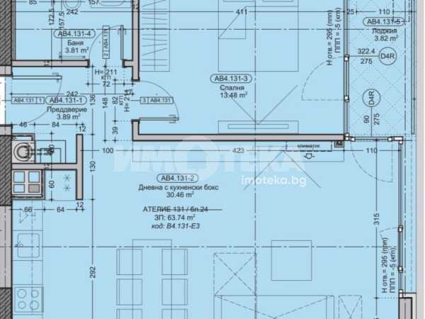Апартаментът е със стаут на ателие и се намира на 3-ти етаж, с изложение запад/север и има обща площ 76.34 кв.м. Състои се от антре, баня/тоалетна, всекидневна с кухня, една спалня, тераса тип лоджия, с излаз от двете стаи.