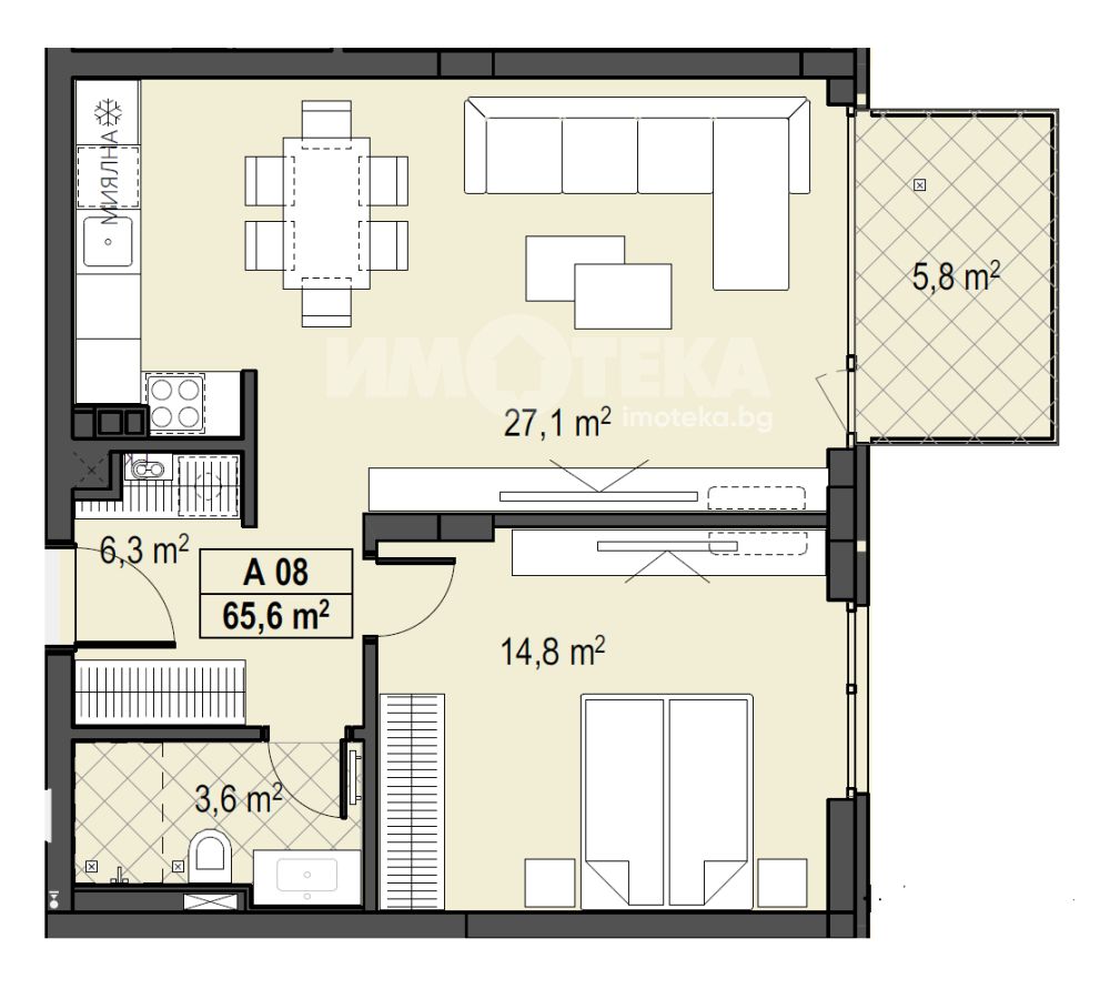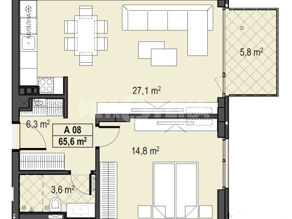 Прекрасен двустаен апартамент с източно изложение, позициониран на първи етаж над партер с РЗП-72,78м2, с просторни стаи и разкошна тераса. Върху площ от 65,6м2 са разположени: дневна с кухненски бокс и трапезария-27,1м2, спалня -14,8м2, баня с тоалетна-3,6м2 и тераса-5,5м2. Налични ПМ и гаражи. Цени без ДДС.