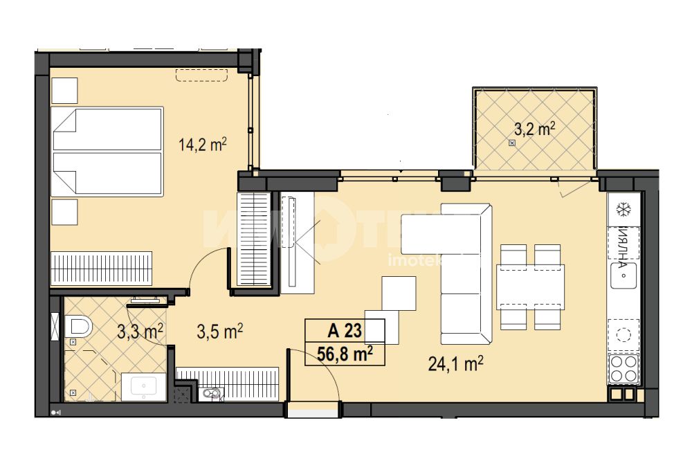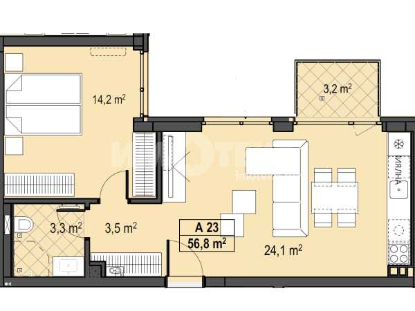 Прекрасен двустаен апартамент, позициониран на трети етаж с РЗП-63,03м2. Върху площ от 56,8м2 са разположени: дневна с кухненски бокс и трапезария-24.1м2, спалня -14,2м2, баня с тоалетна-3,3м2 и тераса-3,2м2. Налични ПМ и гаражи. Цени без ДДС.