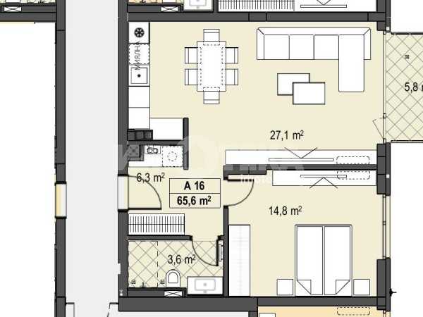 Двустаен апартамент със следното разпределение:дневна с кухненски бокс, спалня, баня с wc, тераса. Схема на плащане 30% на 70%.