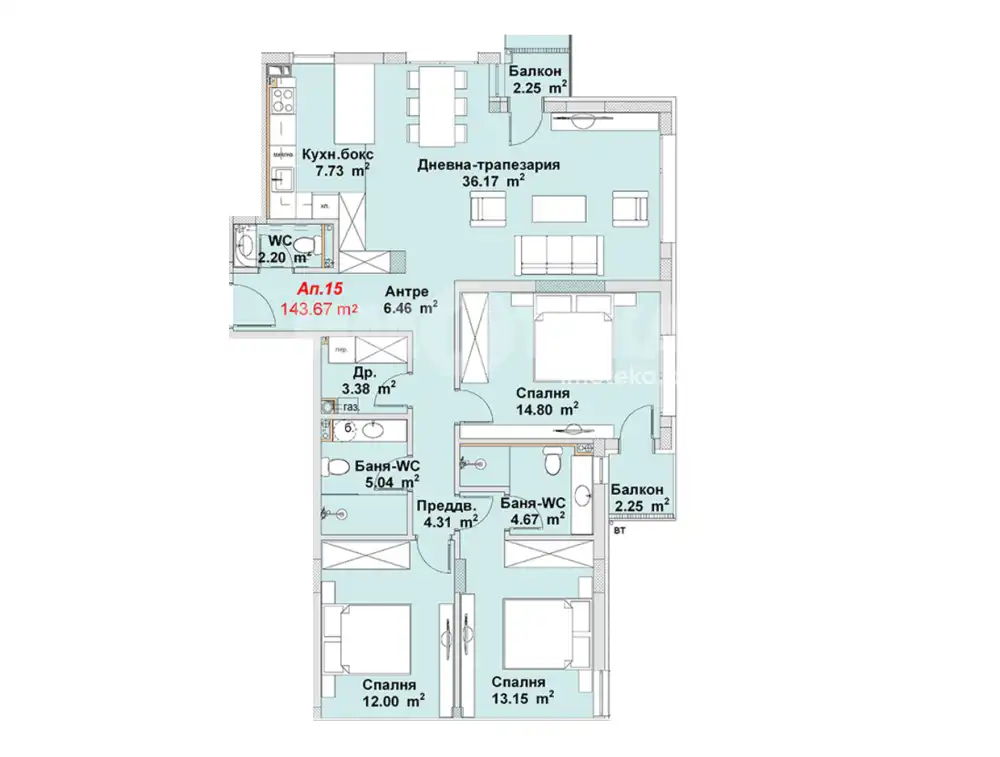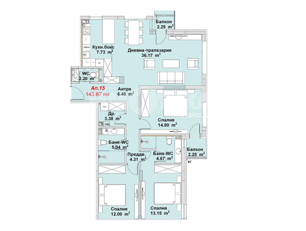 Изцяло южен и много функционален, този многостаен апартамент е разположен на трети етаж и е със следното разпределение: антре, огромна всекидневна с кухненски бокс и трапезария, родителска баня със собствена баня с тоалетна, втора баня с тоалетна, дрешник, две спални, трета тоалетна и два балкона.