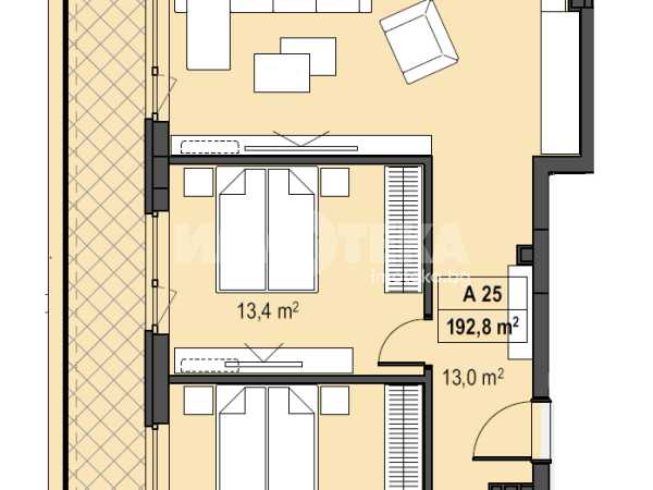 Прекрасен многостаен апартамент със западно изложение, позициониран на последен етаж с РЗП-214,02м2, просторни стаи и разкошна тераса. Върху площ от 192,80м2 м2 са разположени: дневна с кухненски бокс и трапезария-39,4м2, спалня с гардеробна-22,5м2 и баня към нея-3,7м2, втора спалня-13,9 м2, трета спалня-13,4м2, още една баня с тоалетна-3,7м2 и разкошна парти тераса-54,2м2. Налични ПМ и гаражи. Цени без ДДС.