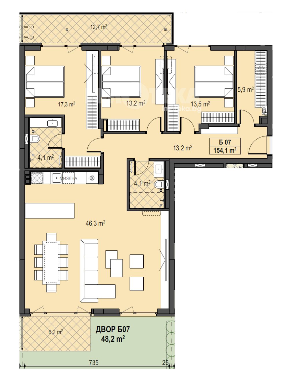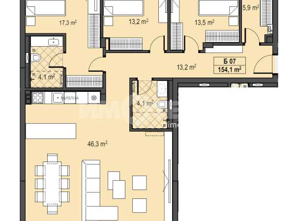 Прекрасен многостаен апартамент с изложение юг/север, позициониран на партерно ниво с РЗП-171,01м2, просторни стаи и разкошен прилежащ двор. Върху площ от 154,1м2 са разположени: дневна с кухненски бокс и трапезария-46,3м2, спалня -17,3м2 с баня към нея-4,1м2, втора спалня-13,2м2, трета спалня-13,5м2, още една баня с тоалетна-4,1м2, гардеробна-5,9м2, тераса-12,7м2, втора тераса-6,2 м2 с достъп към разкошен прилежащ двор от 48,2 м2. Налични ПМ и гаражи. Цени без ДДС.