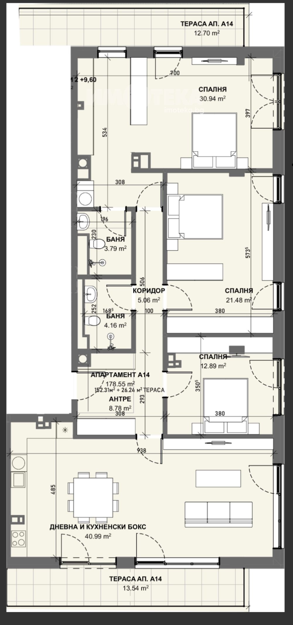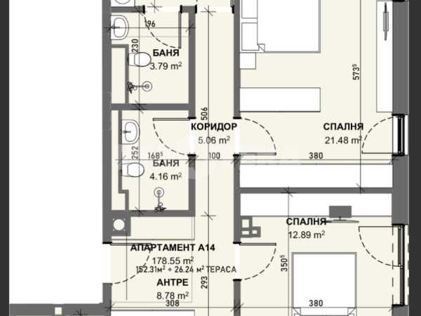 Комплекс от жилищни сгради е разделен на 3 сектора: сграда А, сграда Б и сграда В. Трите сгради разполагат с общ сутерен, разположен на 2 нива посредством закрита рампа, като всяка от сградите има отделен директен достъп до апартаментите чрез стълбище и асансьор. В сутеренното ниво се помещават гаражи, автомобилни паркоместа, велосипедни паркоместа складови помещения.Пред акт 14, една от малкото сгради с канализация в района. Луксозни общи части с висок клас строителни материали! Цените са без ДДС