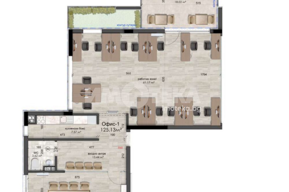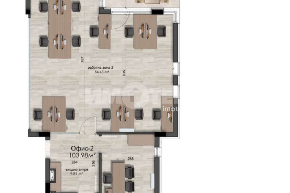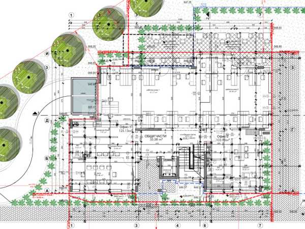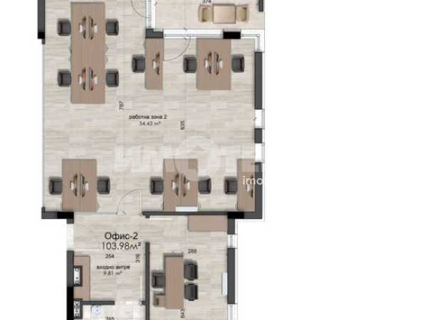 Офис, тип OPEN SPACE с площ 264,74м2 с общите части /ЗП 229,11м2 /.,част от изключително луксозна офис сграда на четири етажа с РЗП 1148,50 кв.м. Ситуиран на първи, партерен етаж с прилежащи открита тераса от 44.04м2 и дворно пространство 18,99м2, за които не се дължи допълнително заплащане и са бонус към квадратурата на имота. Изпълнение с висококачествени материали и с прецизност до най-малкия детайл. Светла височина на таваните 312см. Към офисният етаж се предлагат: двоен гараж на цена 60 000€ и единичен гараж на стойност 30 000€, намиращи се в сутерена на сградата, с широко, маневрено пространство. Разрешение за ползване до края на м.Март 2025г. Предлагаме и изготвен интериорен проект на етажа, подарък към следващите собственици!
