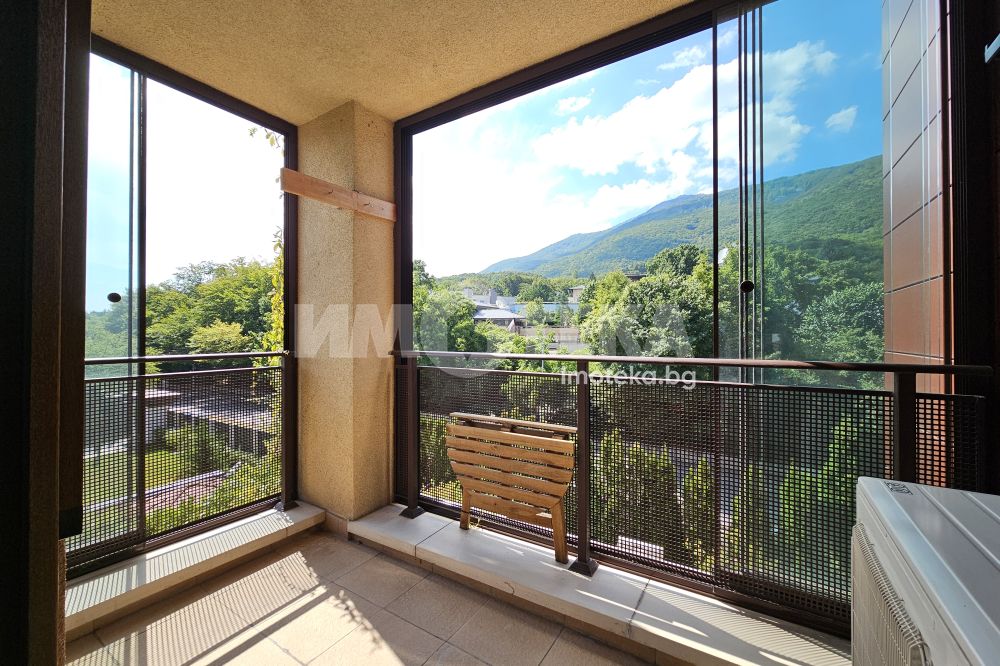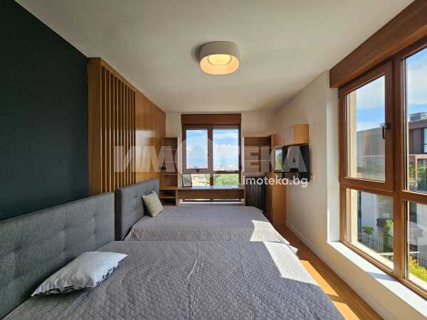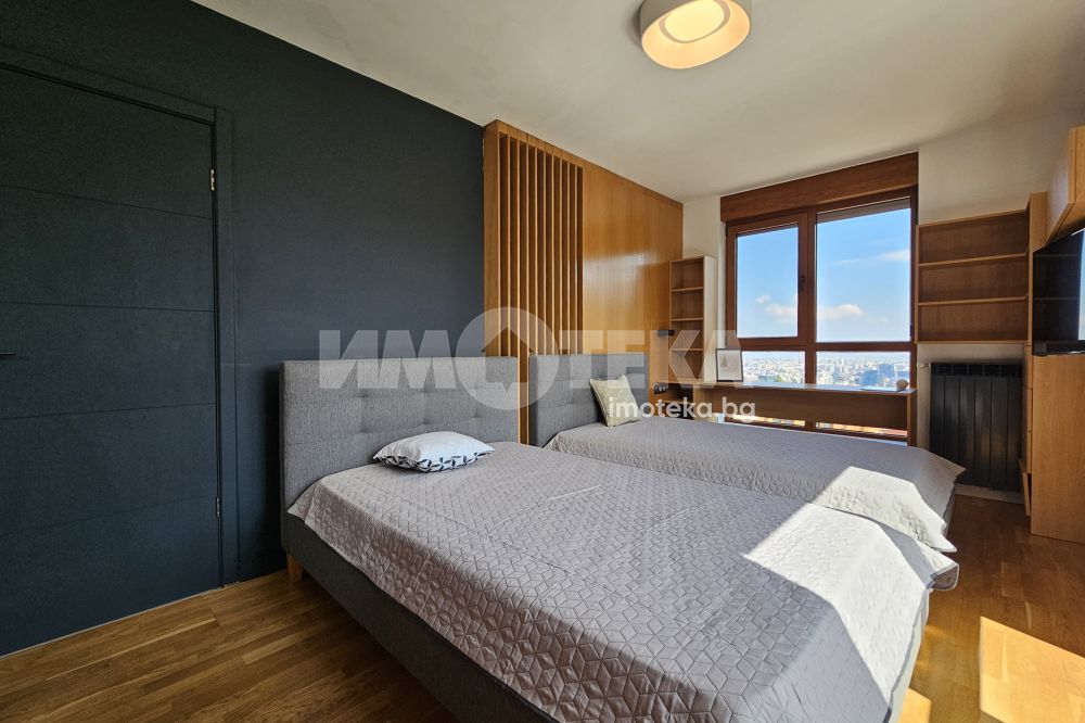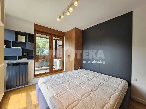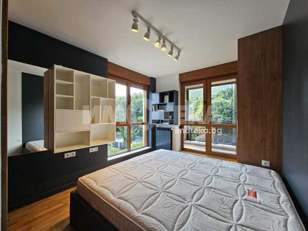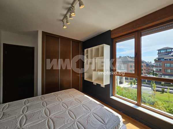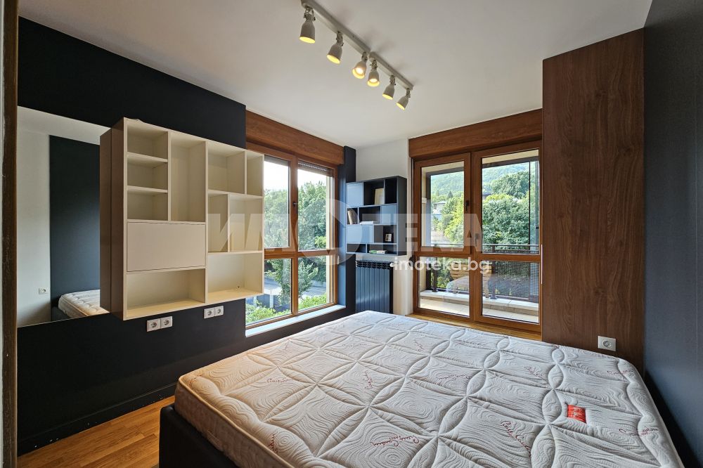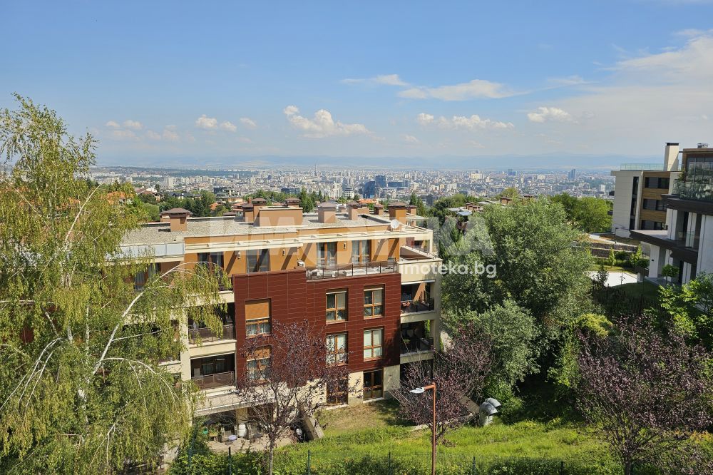Луксозен затворен комплекс с контролиран достъп, охрана, детска площадка, Завладяващата гледка към планината и града. Външни ролетни щори на всяка стая. Подземенно паркомясто включено в наемната цената и възможмност за допълнително наемане на второ паркомясто за 100 евро на месец. Домашни любимци не се допускат.