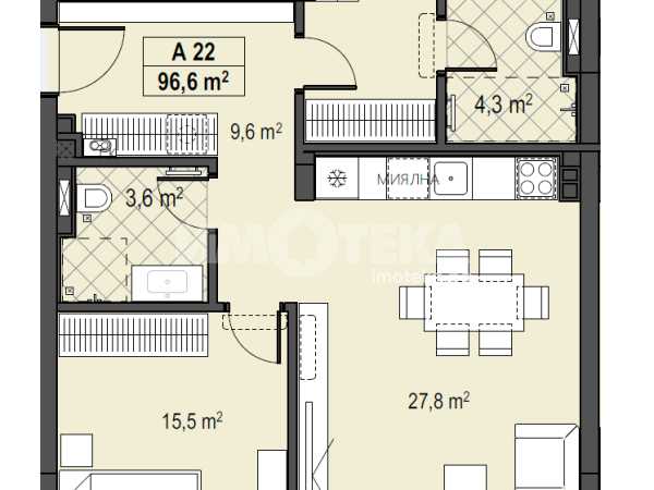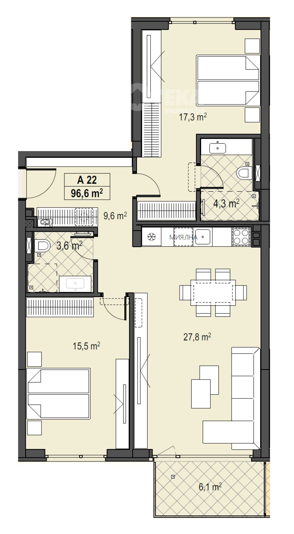 Прекрасен тристаен апартамент с южно изложение, позициониран на трети етаж с РЗП-107,25м2, просторни стаи и тераса. Върху площ от 96,6м2 са разположени: дневна с кухненски бокс и трапезария-27.80м2, спалня -17,3м2 с 4,3м2 баня към нея, втора спалня-15,5м2, втора баня с тоалетна-3,6м2 и тераса-6,1м2. Налични ПМ и гаражи. Цени без ДДС.