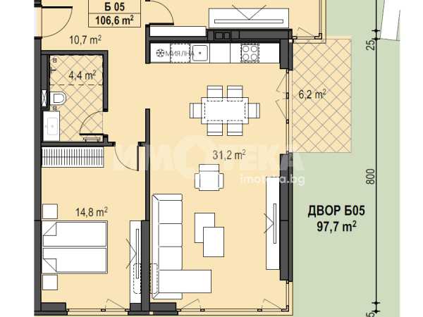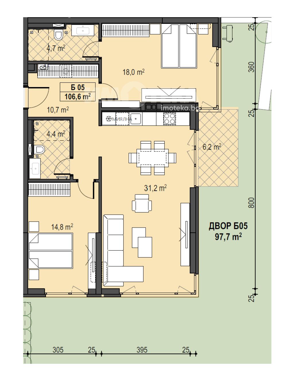 Прекрасен тристаен апартамент с изложение изток/юг, позициониран на партерно ниво с РЗП-118,29м2 , просторни стаи и прилежащ двор. Върху площ от 106,6м2 са разположени: дневна с кухненски бокс и трапезария-31,2м2, спалня -18,0м2 с 4,7м2 баня към нея, втора спалня-14,8м2, втора баня с тоалетна-4,4м2, източна тераса-6,2м2 и голям прилежащ двор от 97,7м2. Налични ПМ и гаражи. Цени без ДДС.