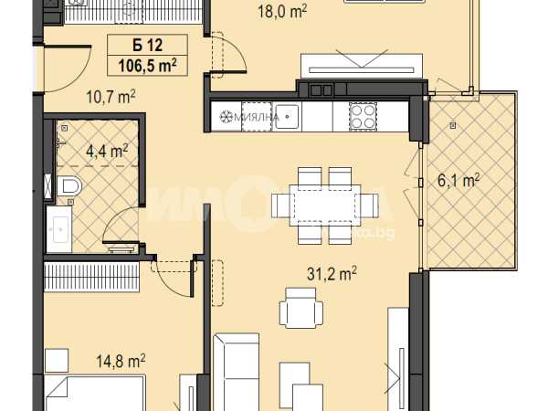 Прекрасен тристаен апартамент със западно изложение, позициониран на първи етаж над партер с РЗП-118,2м2, просторни стаи и разкошна тераса. Върху площ от 106,5м2 са разположени: дневна с кухненски бокс и трапезария-31,2м2, спалня -18,0м2 с 4,7м2 баня към нея, втора спалня-14,8 м2, още една баня с тоалетна- 4,4м2 и тераса-6,1м2. Налични ПМ и гаражи. Цени без ДДС.