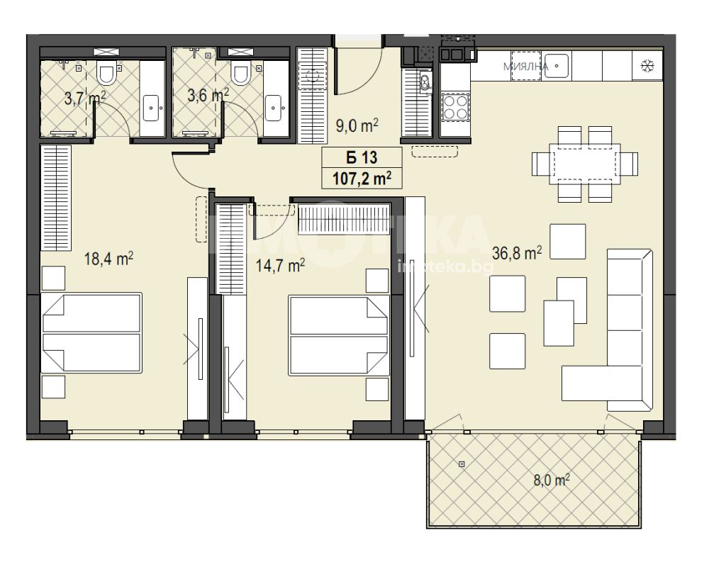 Прекрасен тристаен апартамент с южно изложение, позициониран на първи етаж над партер с РЗП-118,99м2, просторни стаи и разкошна тераса. Върху площ от 107,2м2 са разположени: дневна с кухненски бокс и трапезария-36,8м2, спалня -18,4м2 с 3,7м2 баня към нея, втора спалня-14,7 м2, втора баня с тоалетна- 3,6м2 и тераса-8,0м2. Налични ПМ и гаражи. Цени без ДДС.
