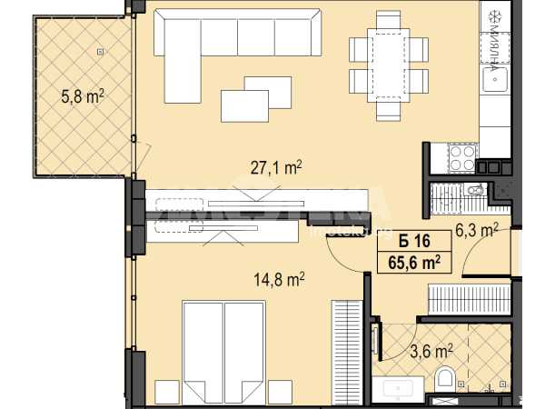 Прекрасен двустаен апартамент със западно изложение, позициониран на трети етаж с РЗП-72,78м2, с просторни стаи и тераса. Върху площ от 65,6м2 са разположени: дневна с кухненски бокс и трапезария-27,1м2, спалня -14,8м2, баня с тоалетна-3,6м2 и тераса-5,8м2. Налични ПМ и гаражи. Цени без ДДС