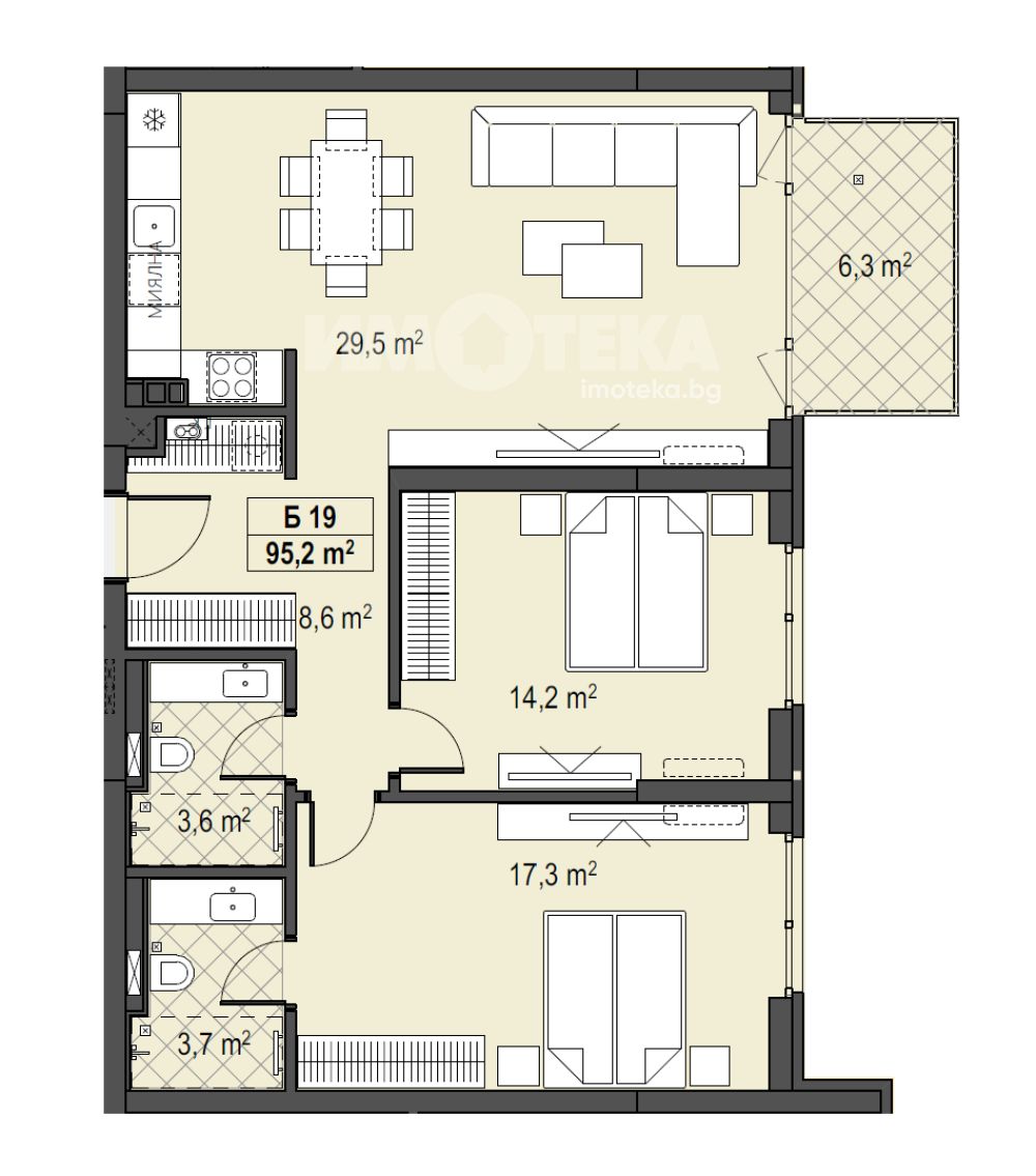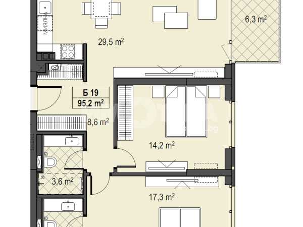 Прекрасен тристаен апартамент с източно изложение, позициониран на трети етаж с РЗП-105,69м2, просторни стаи и разкошна терса. Върху площ от 95,2м2 са разположени: дневна с кухненски бокс и трапезария-29,5м2, спалня -17,3м2 с 3,7м2 баня към нея, втора спалня-14,2 м2, втора баня с тоалетна-3,6м2 и тераса-6,3м2. Налични ПМ и гаражи. Цени без ДДС.