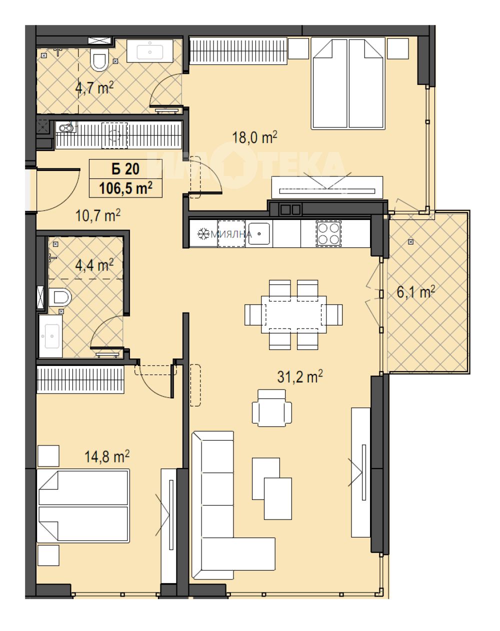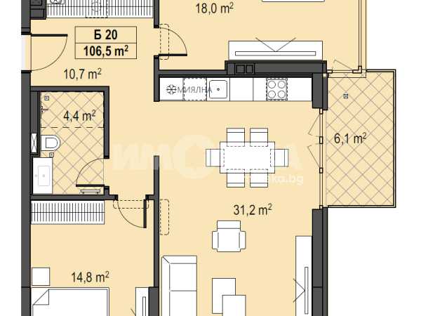 Прекрасен тристаен апартамент с източно изложение, позициониран на трети етаж с РЗП-118,20м2, просторни стаи и разкошна тераса. Върху площ от 106,50м2 са разположени: дневна с кухненски бокс и трапезария-31.20м2, спалня -18,0м2 с 4,7м2 баня към нея, втора спалня-14,8м2, втора баня с тоалетна-4,4м2 и тераса-6.1м2. Налични ПМ и гаражи. Цени без ДДС.