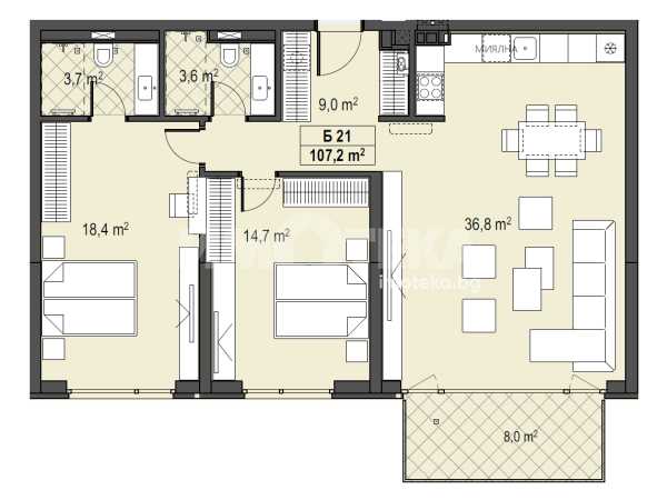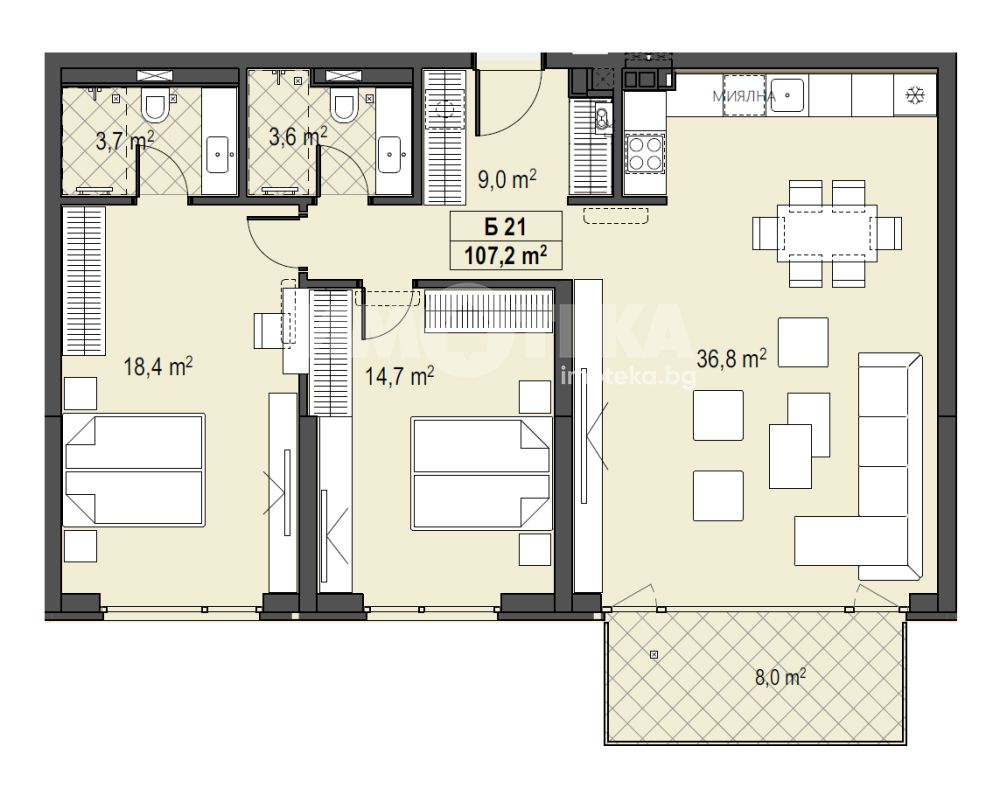 Прекрасен тристаен апартамент с южно изложение, позициониран на втори жилищен етаж/трети реален етаж с РЗП-118,99м2, просторни стаи и разкошна тераса. Върху площ от 107,2м2 са разположени: дневна с кухненски бокс и трапезария-36.80м2, спалня -18,4м2 с 3,7м2 баня към нея, втора спалня-14,7м2, втора баня с тоалетна-3,6м2 и тераса-8,0м2. Налични ПМ и гаражи. Цени без ДДС.