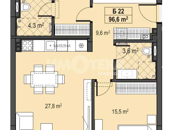 Прекрасен тристаен апартамент с южно изложение, позициониран на втори трети етаж с РЗП-107,25м2, просторни стаи и разкошна тераса. Върху площ от 96,6м2 са разположени: дневна с кухненски бокс и трапезария-27.80м2, спалня -17,3м2 с 4,3м2 баня към нея, втора спалня-15,5м2, втора баня с тоалетна-3,6м2 и тераса-6,1м2. Налични ПМ и гаражи. Цени без ДДС.