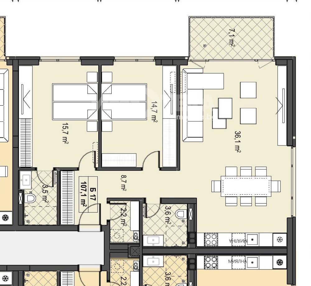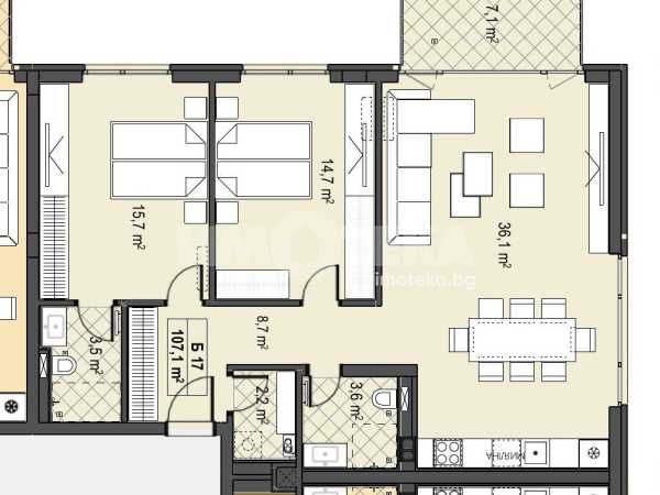 Тристаен апартамент разполагащ със просторна дневна 30 кв.м с тераса, две спални 14 и 17 кв.м и две бани с тоалетни.
